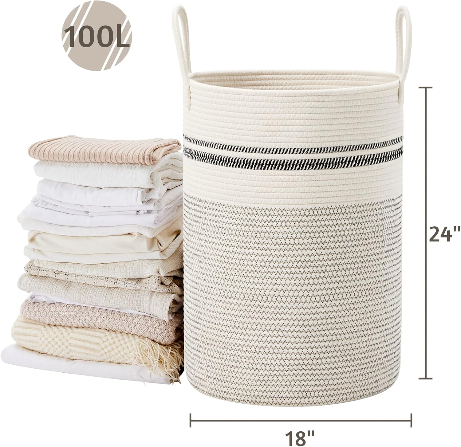 VIPOSCO Large Laundry Hamper, Tall Woven Rope Storage Basket for Blanket, Toys, Dirty Clothes in Living Room, Bathroom, Bedroom - 100L Stripe White