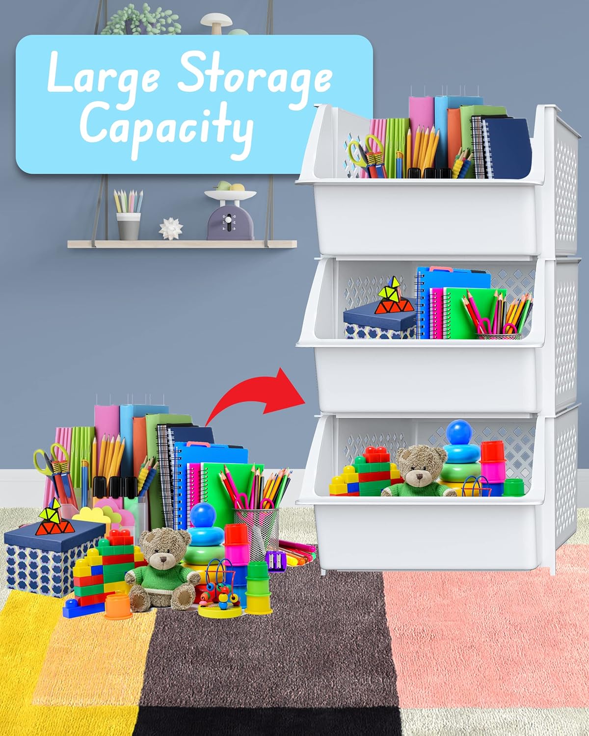 • KEEPS ESSENTIALS ORGANIZED AND VISIBLE - Stackable bins hold foods, toys, utensils, and toiletries without bending off. Set of 3, Each bin size: 14.5” x 11.5” x 7”.