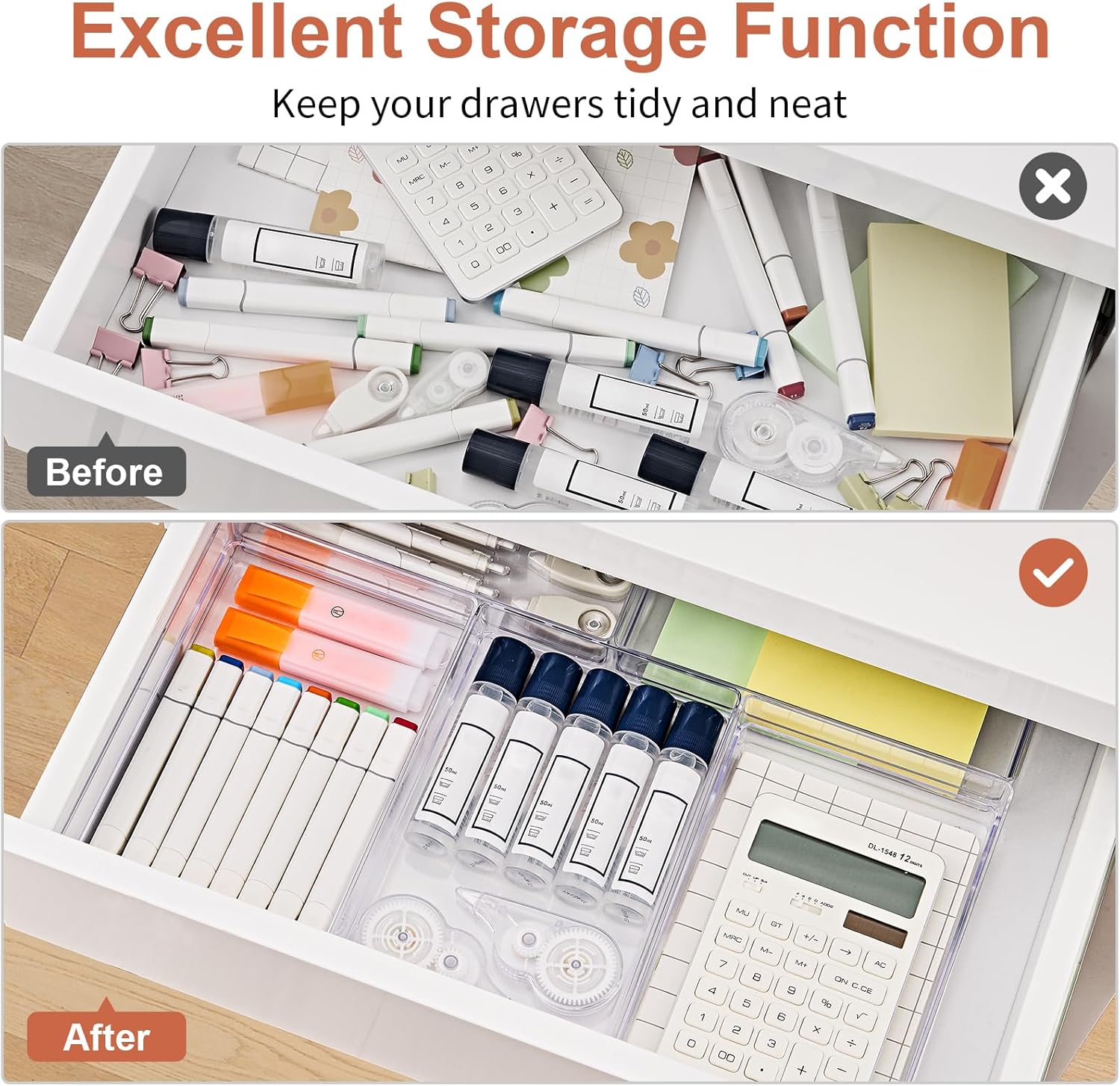 • Space Saving and Stackable Trays: Stackable drawer organizers can be stacked and sorted out in your space easily. Clear drawer organizers can save you time to organize and find your stuff, it’s easy to find and use your items in the drawer, keep your space neat, and help you get a neat lifestyle and enjoy more.
