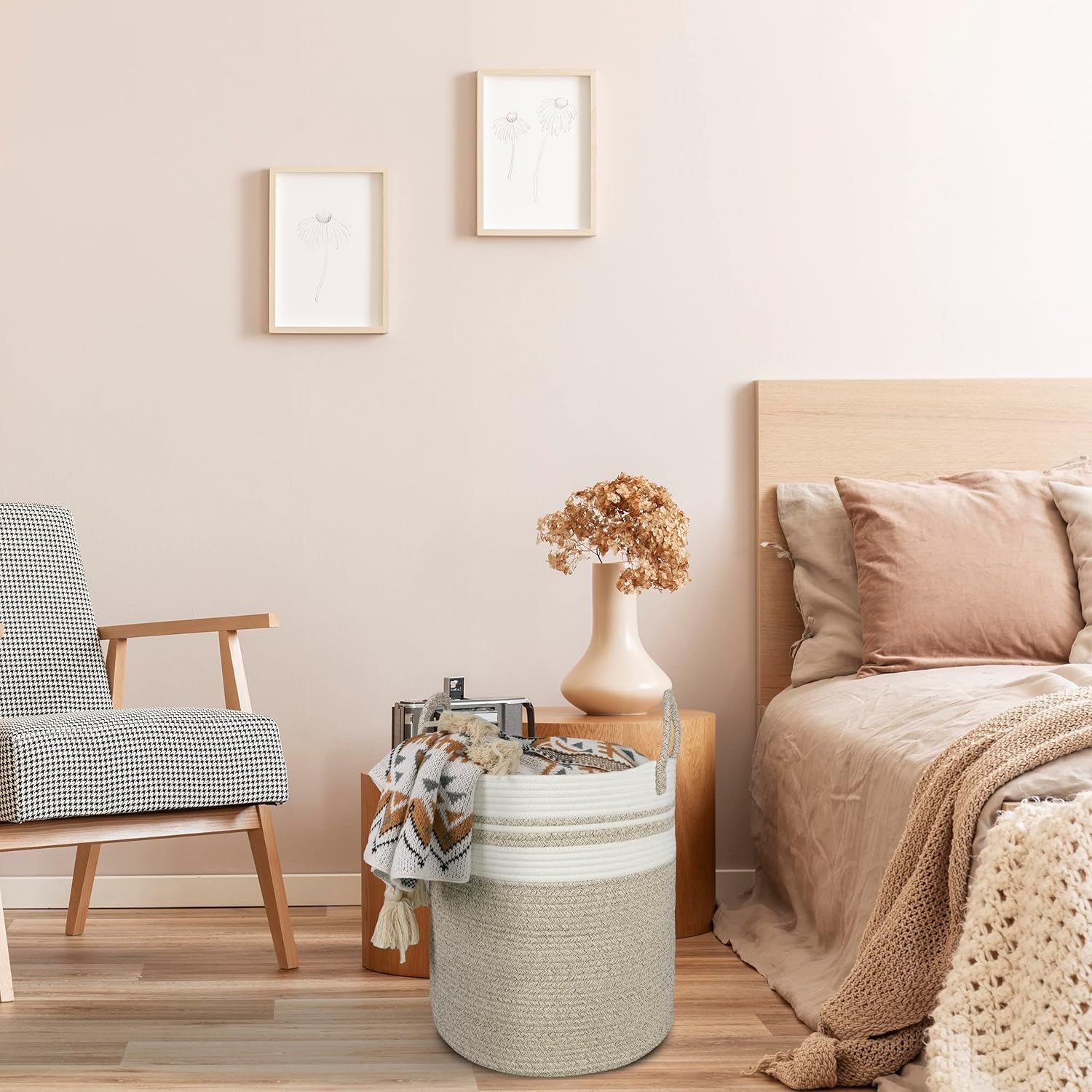 • Tall storage basket with handles: This cute tall round rope basket is designed with long and sturdy handles, making it easy to move around. As the clothes storage basket is made of soft cotton rope, it has no sharp edges and will not scratch your furniture or floor.