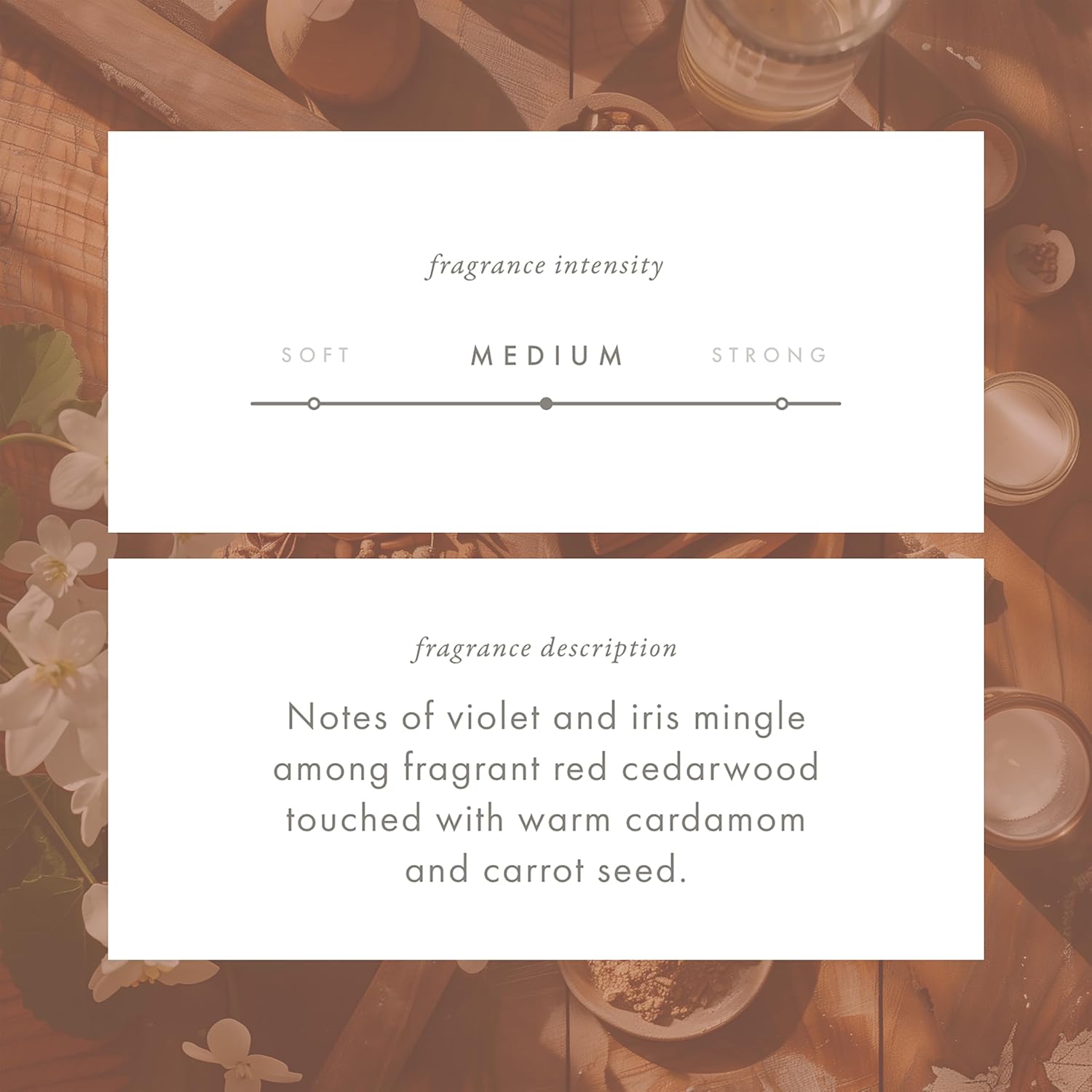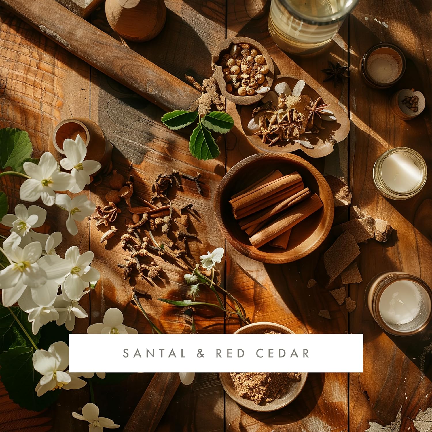 • THE FRAGRANCE: Santal & Red Cedar features notes of violet and iris mingle among fragrant red cedarwood touched with warm cardamom and carrot seed.