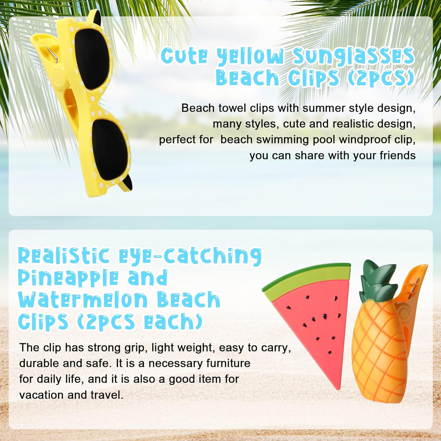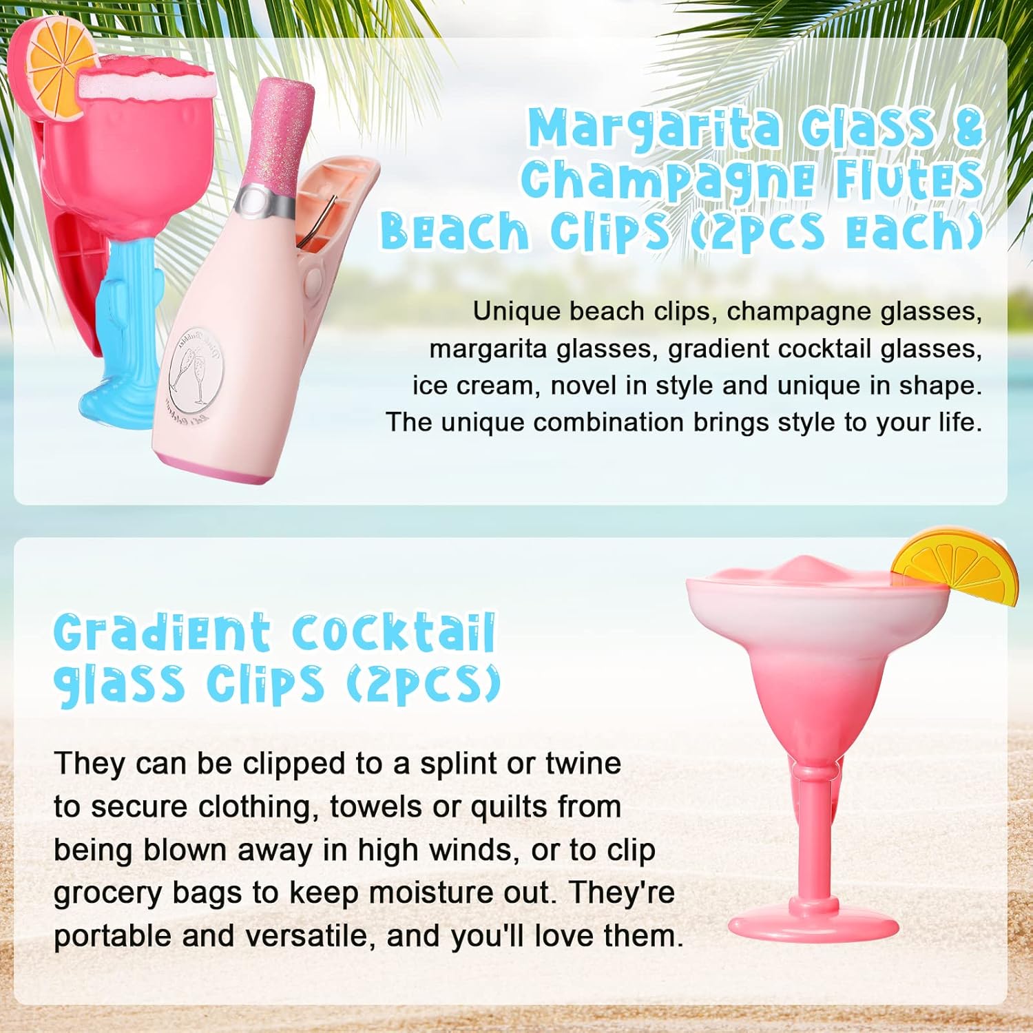 • Cute and Funny: these beach towel clips adopt champagne glasses, margarita glasses, cocktail glasses, sunglasses, pineapple and watermelon styles, look cute and funny, you can use them to clip cloths, towels or bedding