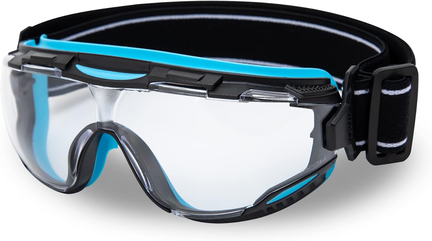 DEX FIT Protective Safety Goggles SG220; Anti Fog & Scratch, Z87 Eye Protection for Lab, Science, and Chemistry Work, Adjustable for Women and Men, (Black & Blue Frame, Clear Lens, 19cm Strap)