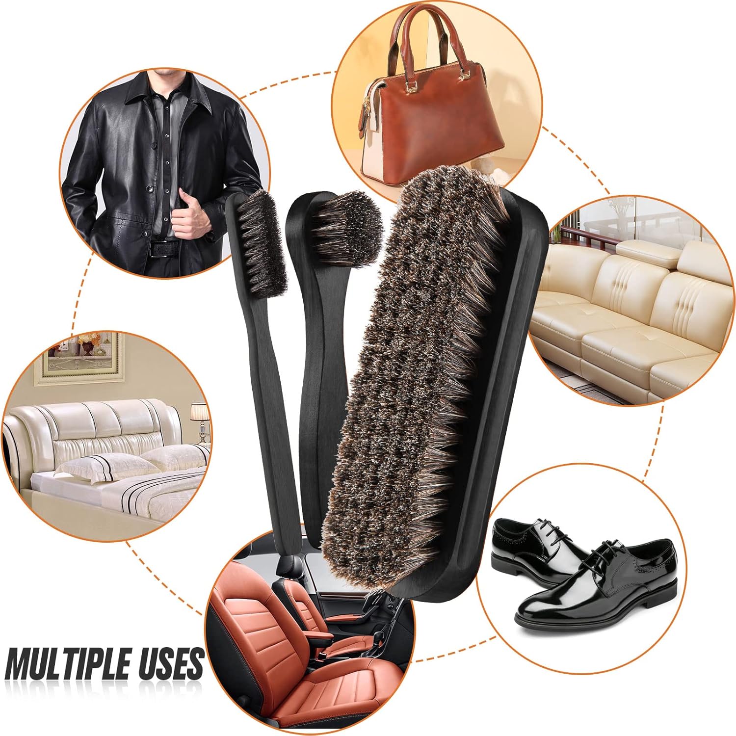 • Mufti-functional shoes brush set - This set contains 1 pieces shoes brushes, 1 piece mini shoe cream brush and 1 piece shoes shine cloth, suitable for shoes, handbags, luggage, boots, gloves, jacket, coat, car auto upholstery