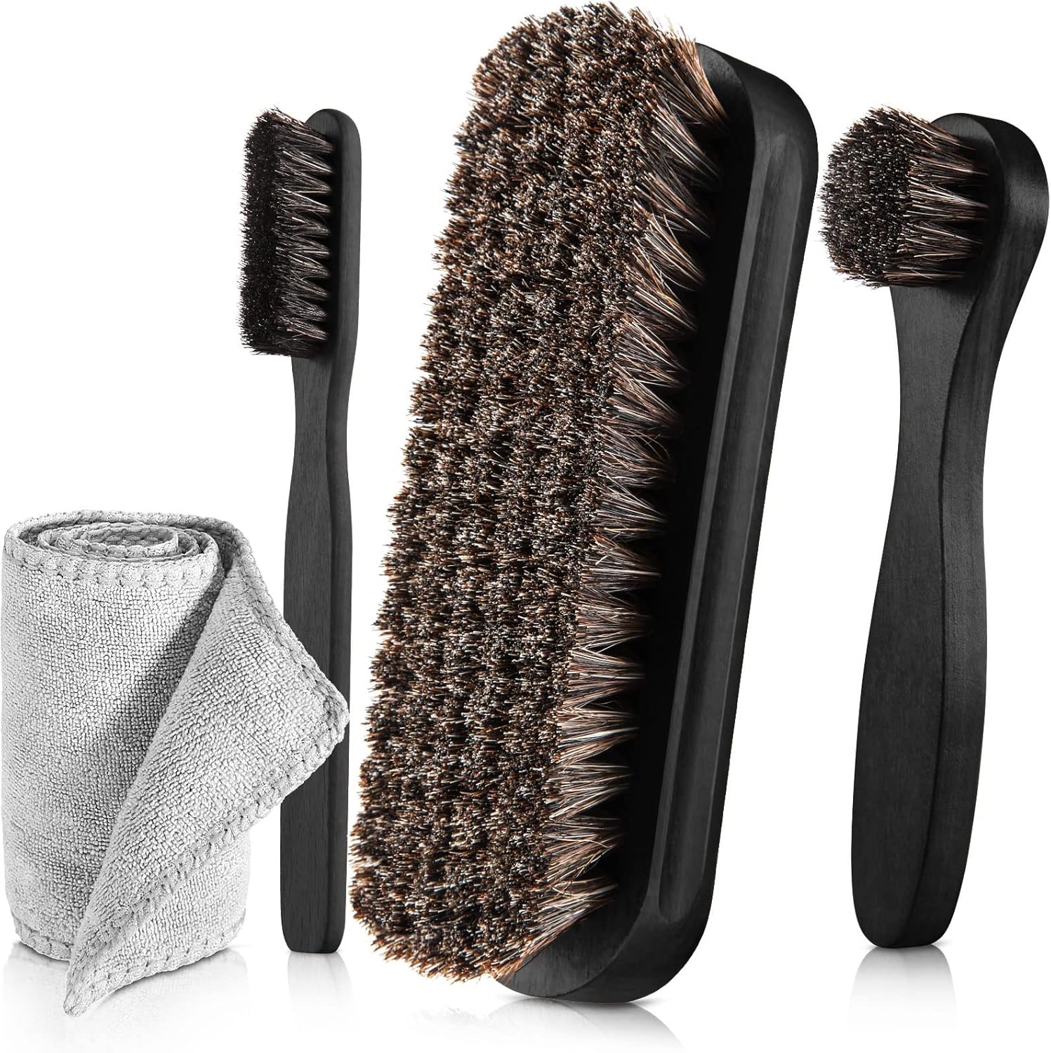 • Shoes Shine Brush Set - There are 1 x large size shine brush, 1 x long handle horsehair brush, 1 x detailing shoe brush and 1 x microfiber buffing cloth