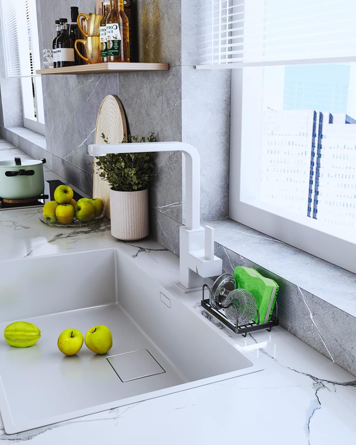 • [Removable Drip Tray & Spill-Proof Design]: The sponge caddy comes with a plastic drip tray that collects drips from the sponge. The tray is easy to pull out, drain and rinse. Kitchen sponge holder for sink tray is designed to be deepened to hold more drips and the water does not spill easily, effectively preventing water stains from contaminating the kitchen countertop and keeping your kitchen counter dry
