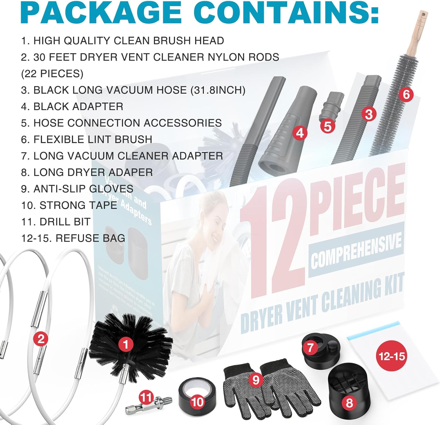 • [Efficient dryer cleaning kit]-Professional dryer vent cleaning tool set can help you deep clean buildup lint in the dryer. Including 30feet vent cleaner set × 1, Dryer Lint Vacuum Attachment × 1, Long Lint Trap Brush × 1, Vacuum Cleaner Adapter x1, Dryer Adapter x1, Drill Bit x 1, Strong Tape(for nylon rod) x1, Anti-slip Gloves x1, Refuse Bag x1