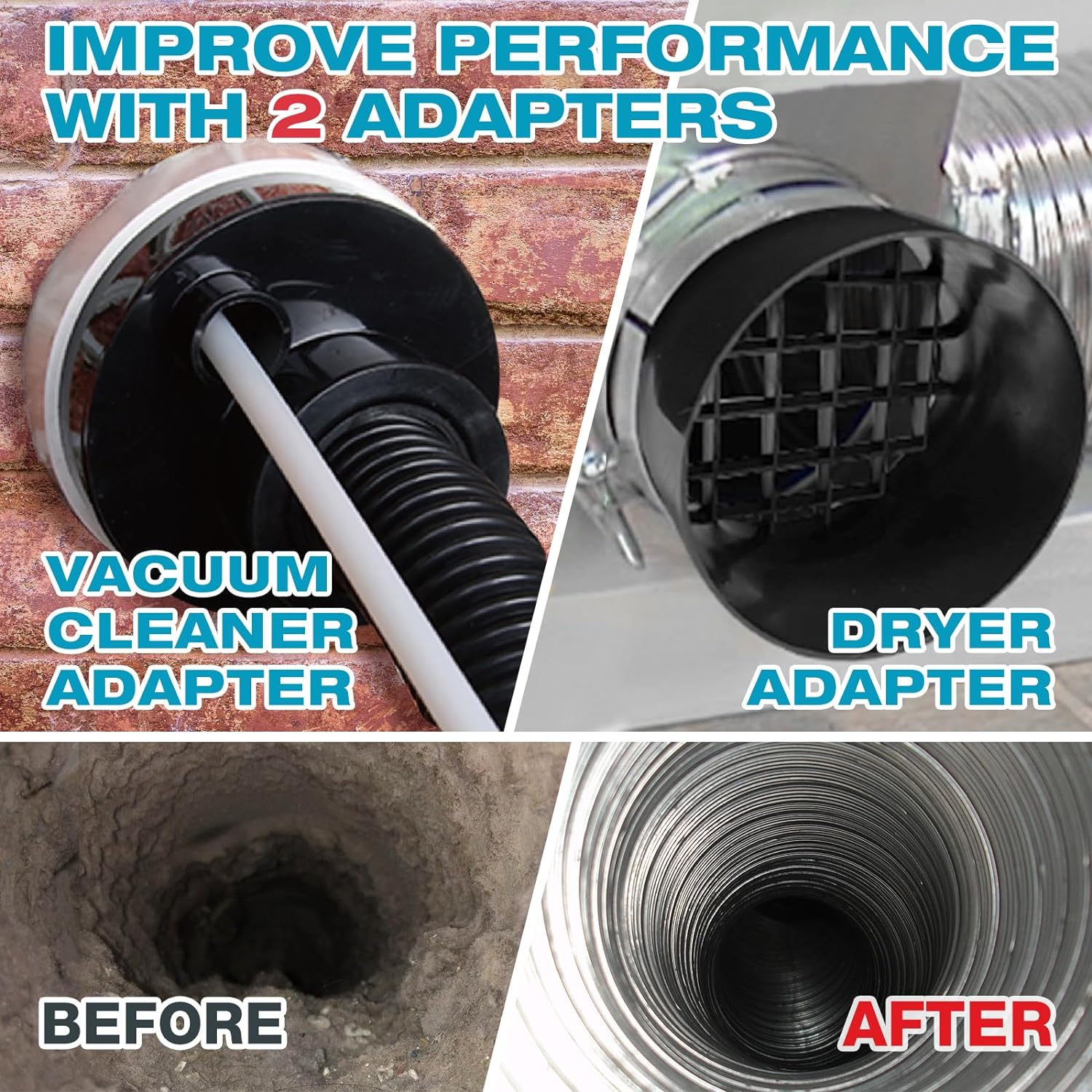 • [30feet Dryer Vent Brush] - Easy to use with your drill, the 22 flexible nylon rods can be quickly connected and extended to 30ft.Included adapters enable you to use the air from the clothes dryer, shop vacuum or electric blower to completely remove lint from the vent while rotary cleaning at the same time. The Dryer Vent Brush also acts as air duct cleaning kit suitable for pipes/air duct or corners
