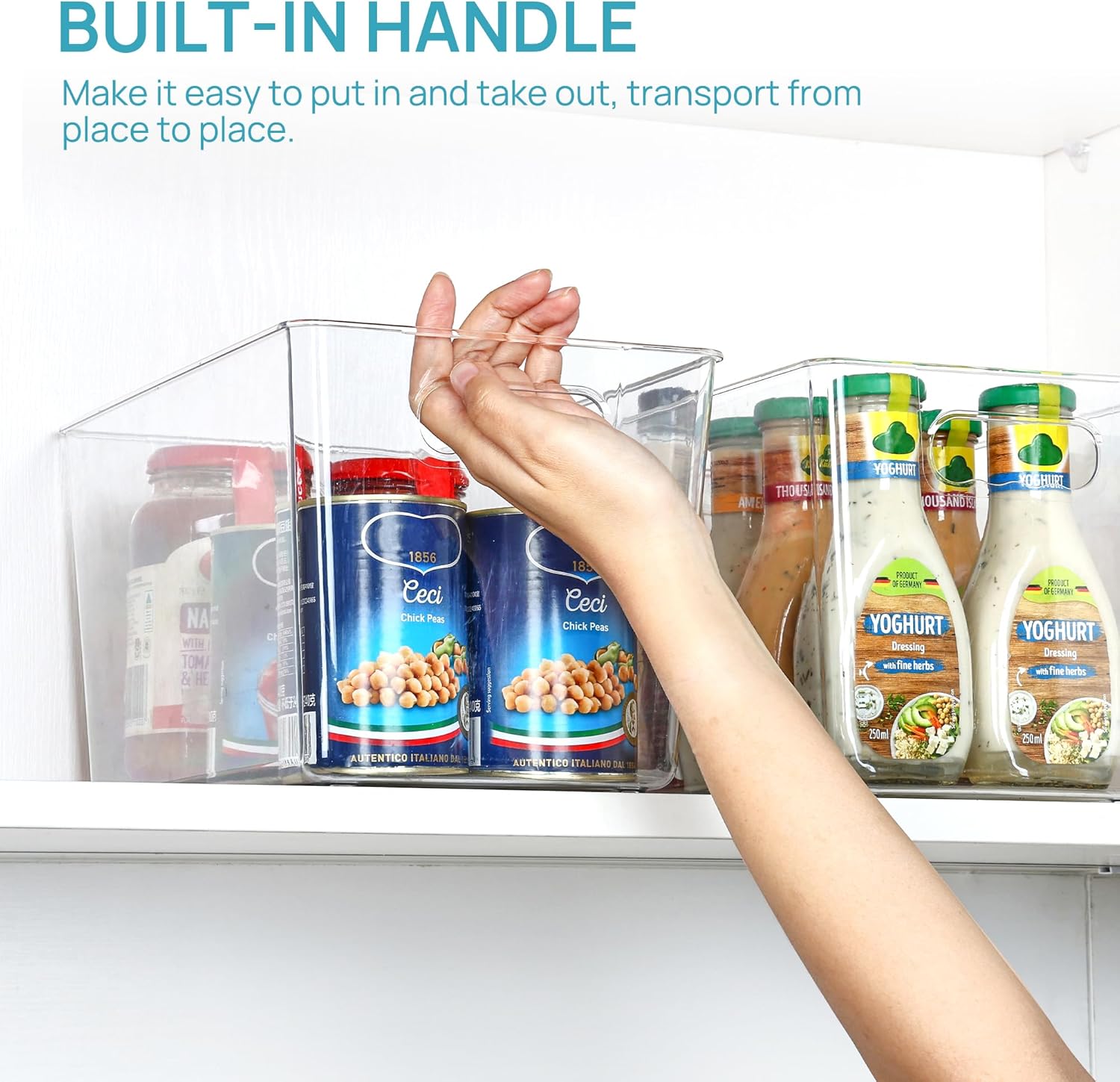 • Built-in Handles ---- The bins have handle grips on the edge making it easy to carry and access contents. You just take the bins out and get the items you want, then put it back in so simple. Organize all of your kitchen essentials to make organizing and everyday living with ease, creating a clean and organized home.