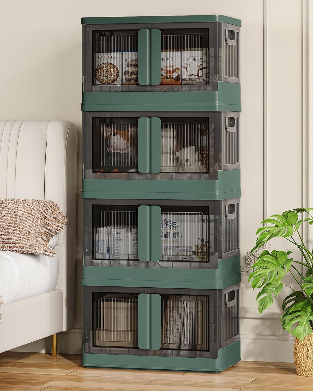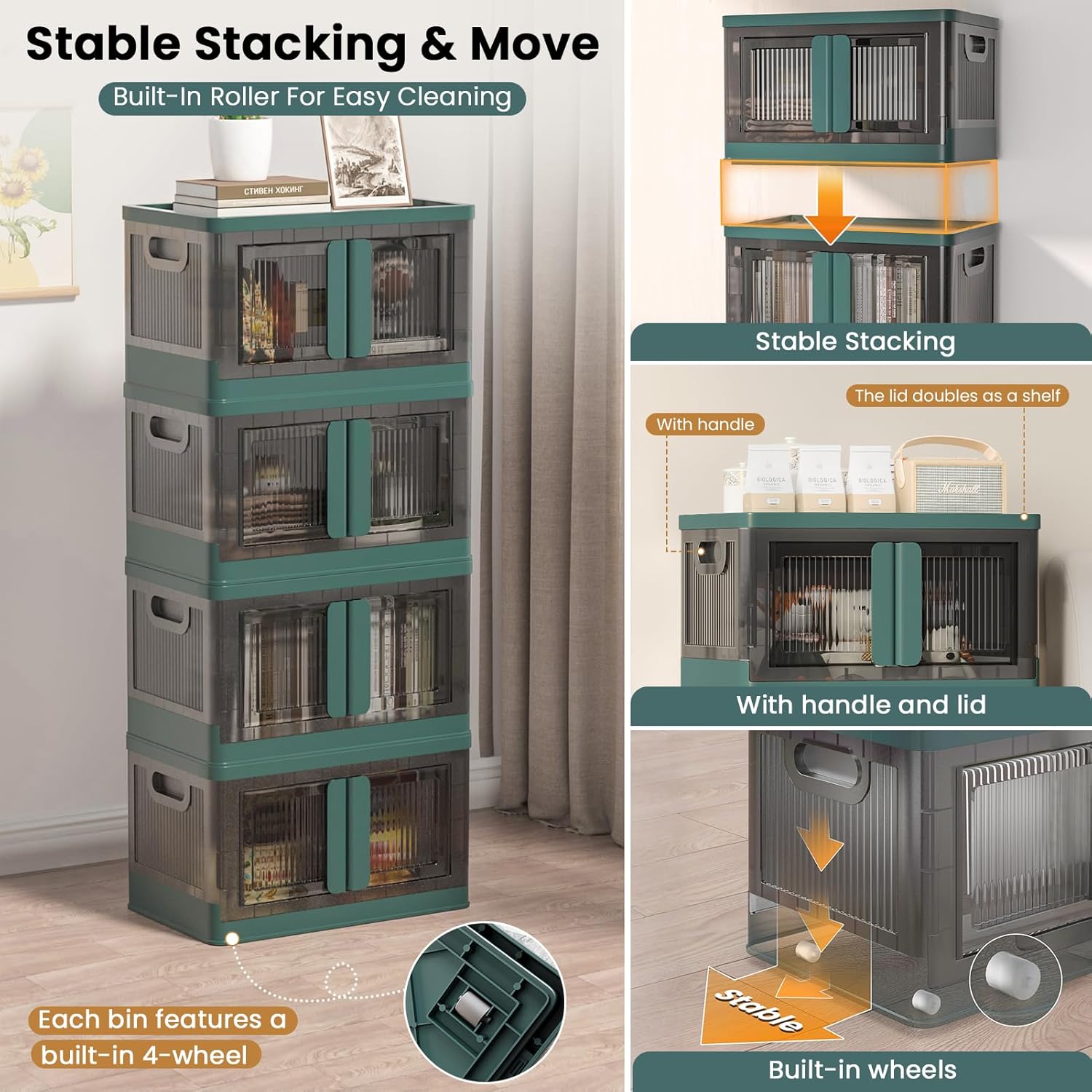 8.4Gal Collapsible Storage Bins with Lids & Wheels - 4 Pack Stackable with Doors, Heavy-Duty Plastic Containers for Home/Office, Green
