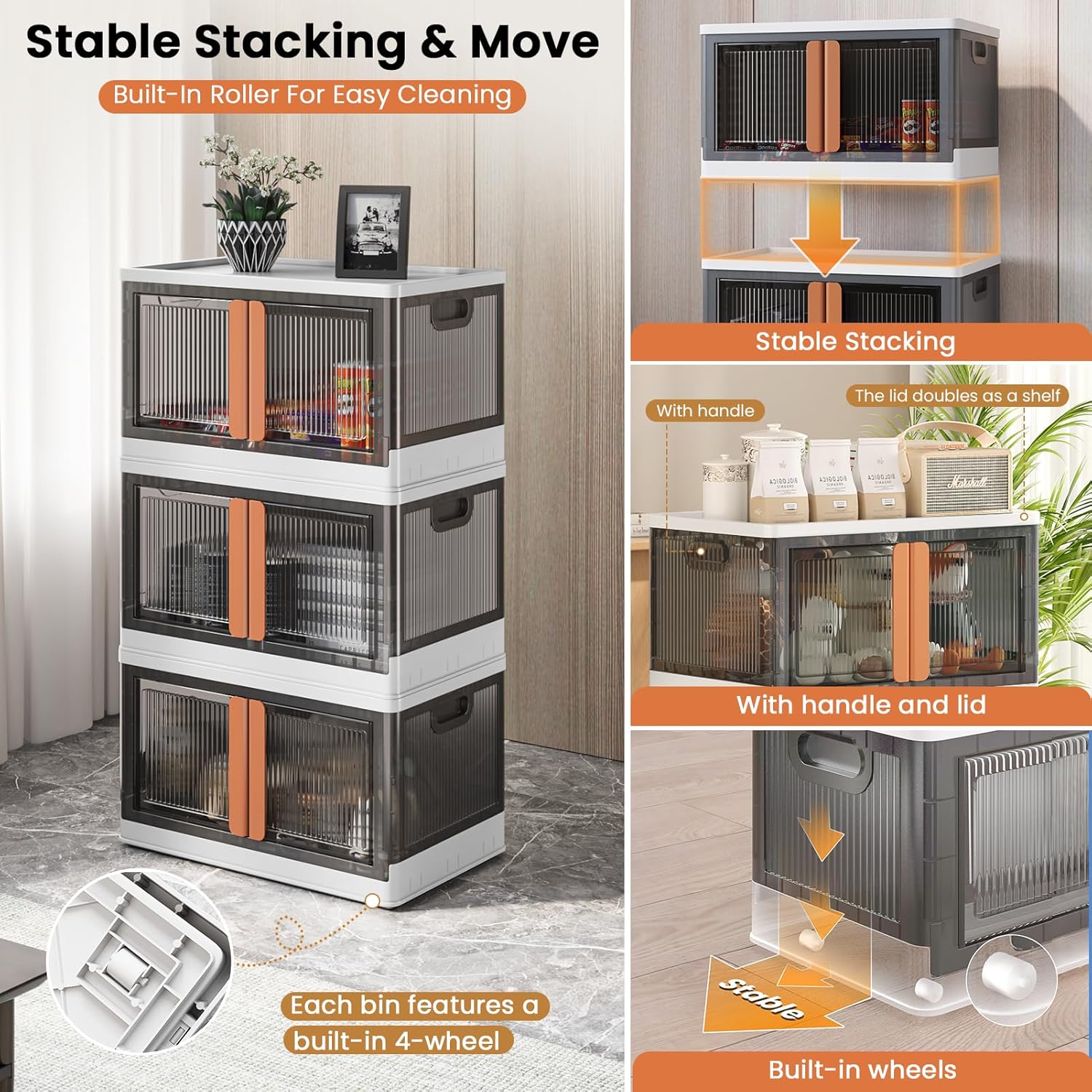 • Stable Stacking & Move: Each storage bin features a built-in recessed 4-wheel base that can move side-to-side, with a full-ground contact design for enhanced stability. The lid of each bin includes 4 built-in grooves for secure stacking