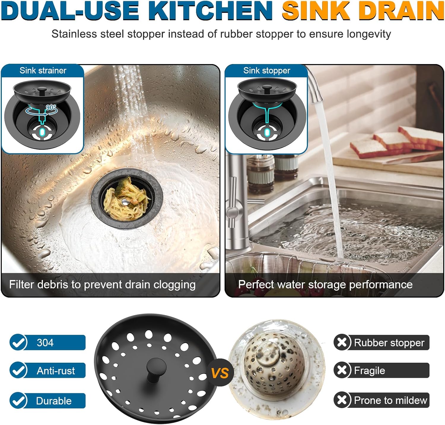 • EFFECTIVE STRAINER -- The removable strainer basket features double rows of drainage holes to capture debris during draining. The kitchen sink drain can effectively prevent food debris or trinkets from entering the sink drain to cause water clogging