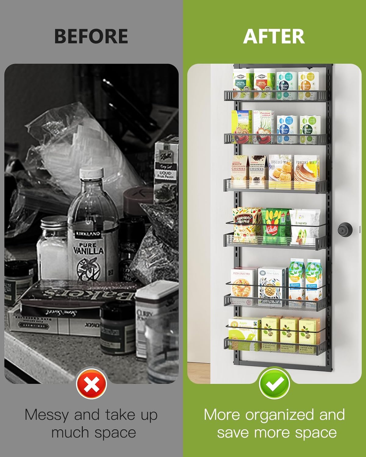 • HANG BEHIND THE DOOR OR DRILL TO WALL-MOUNT! Our door pantry organizer is designed for doors 22" or wider, and also comes with a wall-mount panel for you to choose from. It's also apartment and tenant friendly, so you're sure to get a solution you'll be happy with.