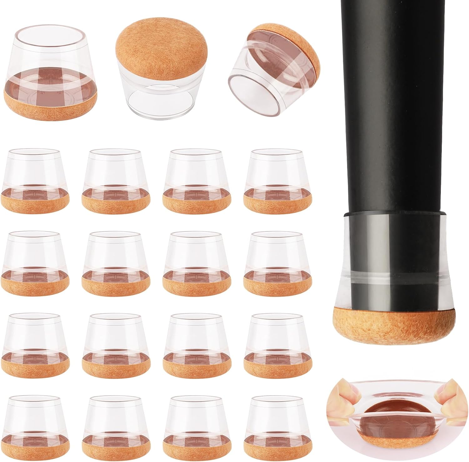 • 【Upgrade New Design】: 360° full felt pad bottom wrapped, which helps the felt bottom be able to touch the floor at any angle, preventing scratching the floor. Our chair leg floor protectors do not use gel. The bottom felt pad and the silicone chair leg floor protectors are integrated with a high-pressure machine to ensure that they will never fall off.