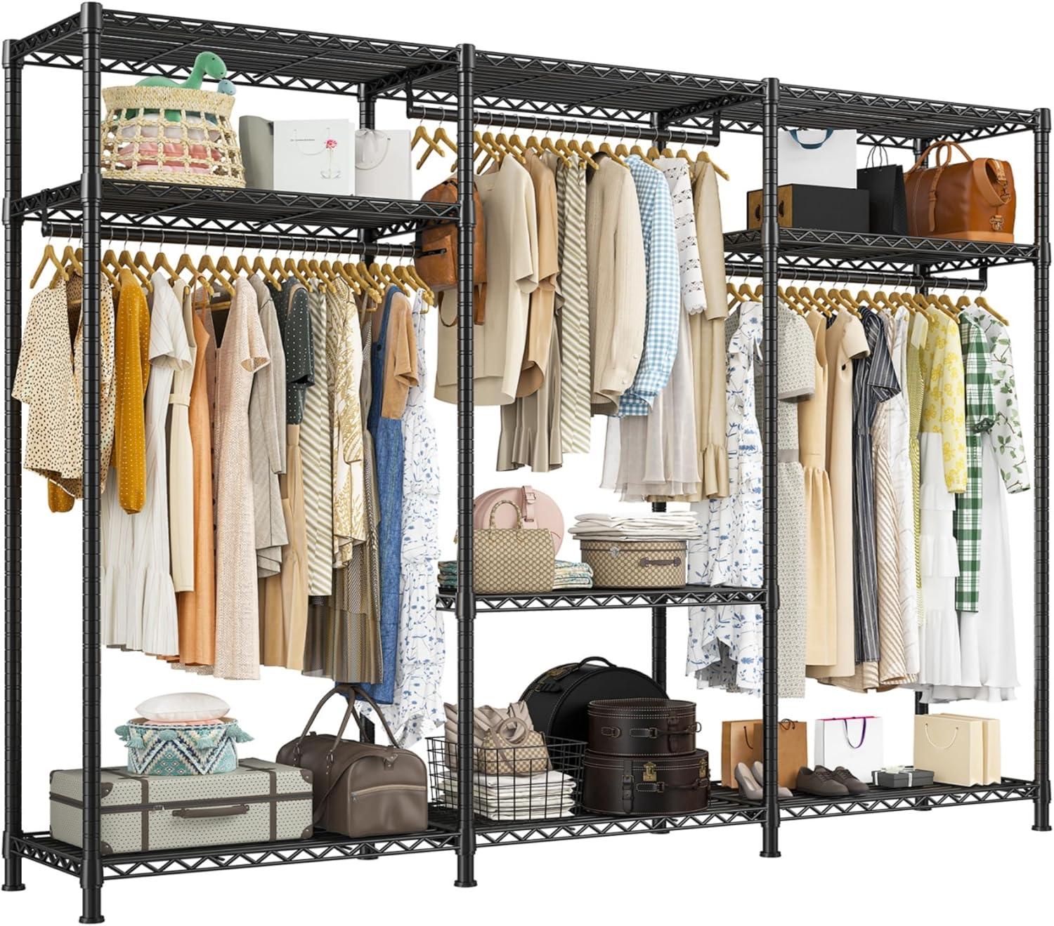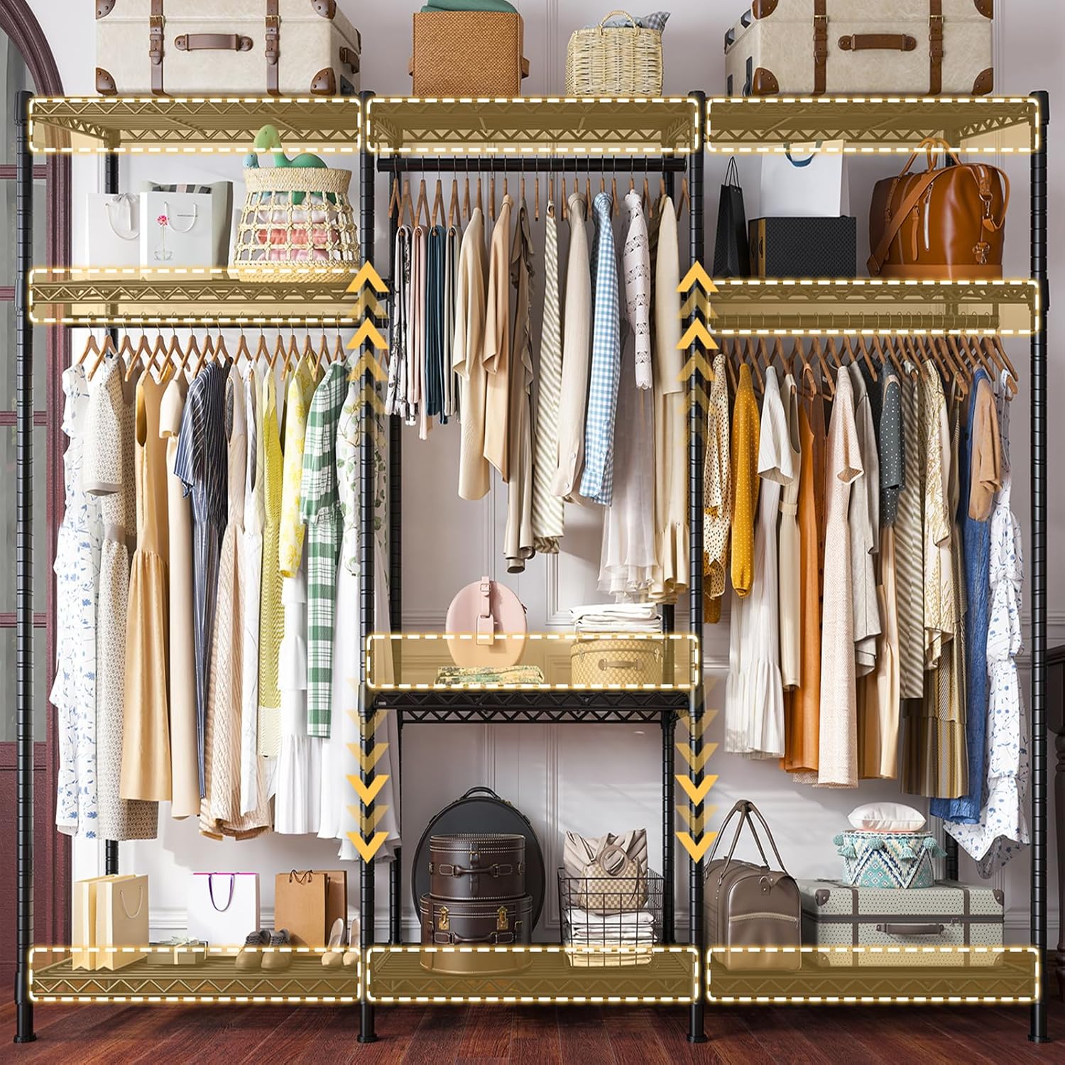• 【9 Adjustable Shelves & 3 Detachable Hangers】The garment rack for hanging clothes are all easily adjustable and detachable by the slip-sleeve locking system, all you need to do is assemble the clips higher or lower. 9 shelves can put luggage, quilt, storage box or shoes, etc. 3 Metal hangers can hang long dress or coats saving and keeps room clean and tidy. A perfect DIY portable clothes rack meets all needs.
