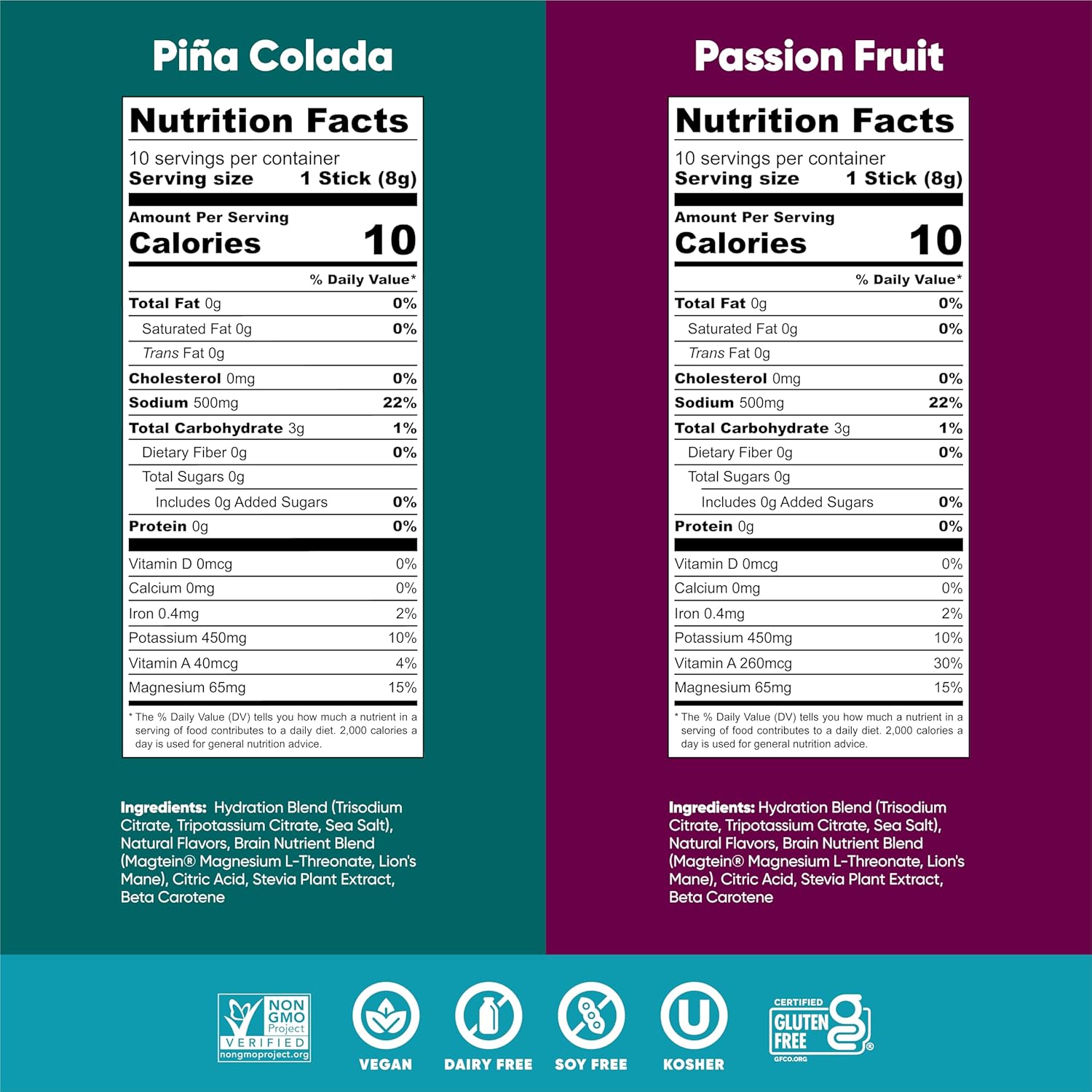 • DELICIOUS FLAVORS ON-THE-GO: Just mix one packet with 16oz of water for refreshing hydration anytime. Enjoy crave-worthy flavors like Blood Orange, Blueberry Pomegranate, Lemon Lime, Peach Mango, Raspberry Lemonade, Yuzu Mango, Iced Tea + Lemonade, Passion Fruit, Pina Colada, plus a convenient Variety Pack. A better-tasting, brain-boosting way to stay hydrated daily