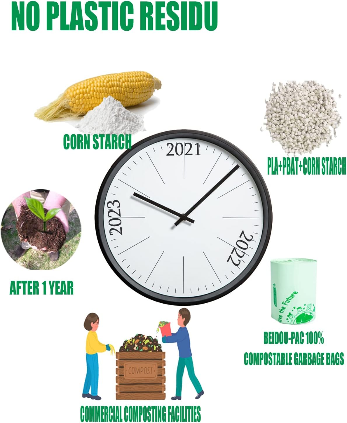 • [SAFE & NO PLASTIC RESIDU] -- BEIDOU-PAC 100% Certified Compostable Kitchen Food Scrap Bags, Kitchen Compost Bin Compatible, are safer for the environment, which are mainly made from PBAT & PLA & Vegetable starch like corn, and completely degrade into biomass, water and CO2. after 1 year when placed in both home and commercial composting facilities. 100% compostable food waste bin bags are made from plant vegetable and 100% return back to earth.