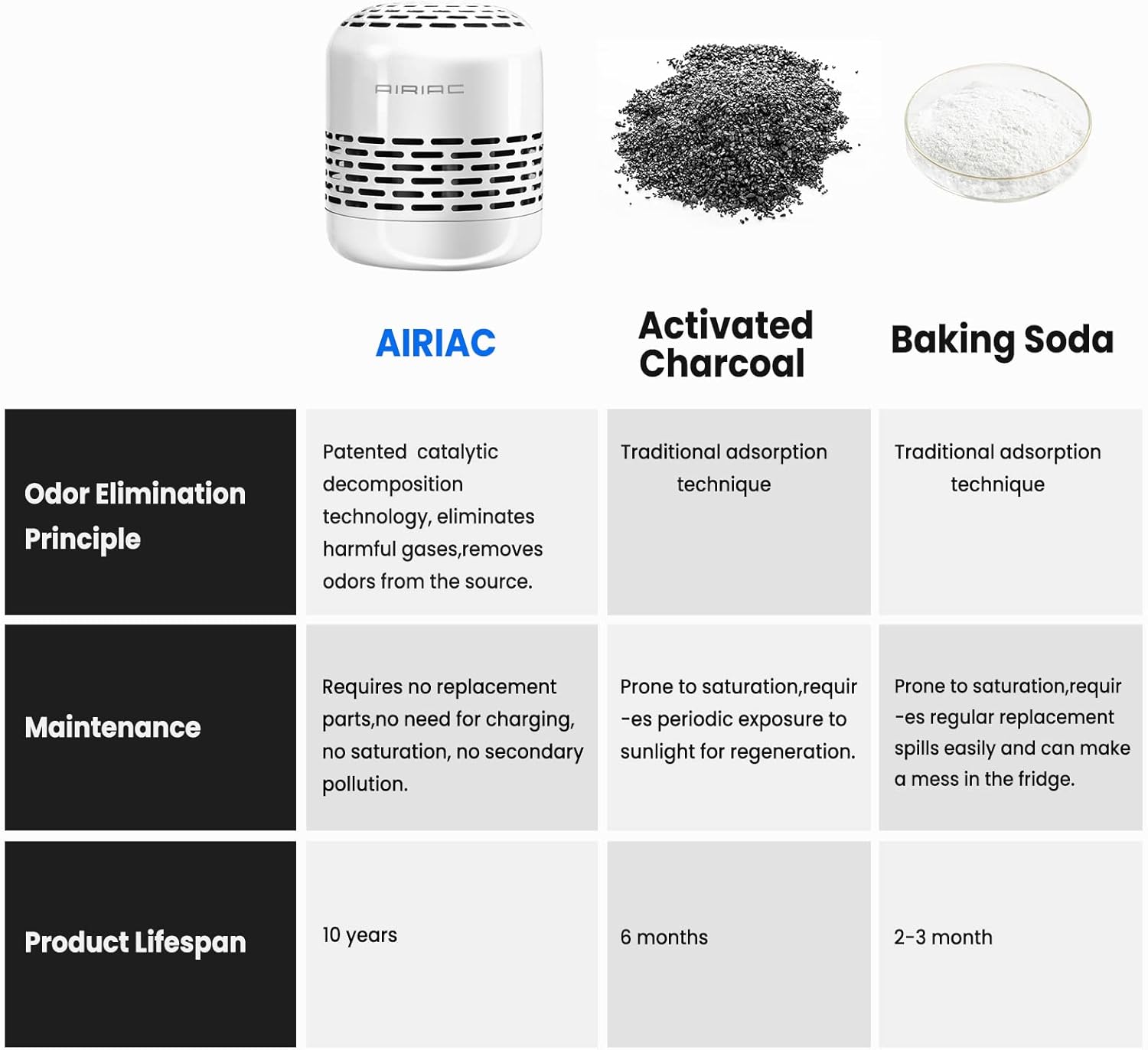 • PORTABLE & VERSATILE KITCHEN GADGET: Our compact and lightweight refrigerator odor eliminator is designed for convenience at home or during travel. It works wonders in various smelly places such as fridges, cars, wardrobe drawers, shoe cabinets, gym bags, and more small spaces.