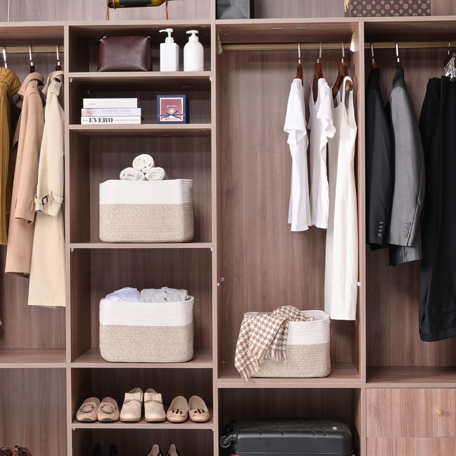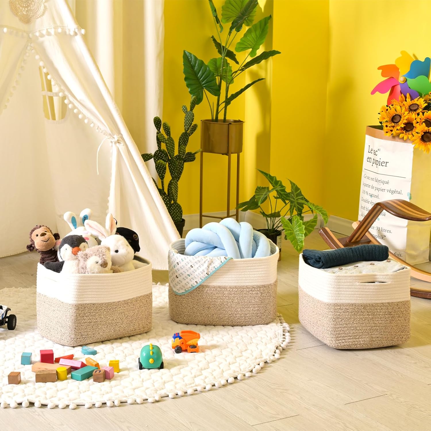 Storage Baskets for Organizing, Woven Cotton Rope Basket for Storage Books, Baby Organizing Baskets, Toy Storage Basket, 15"x11"x9.5", 3 Packs, Off White & Brown
