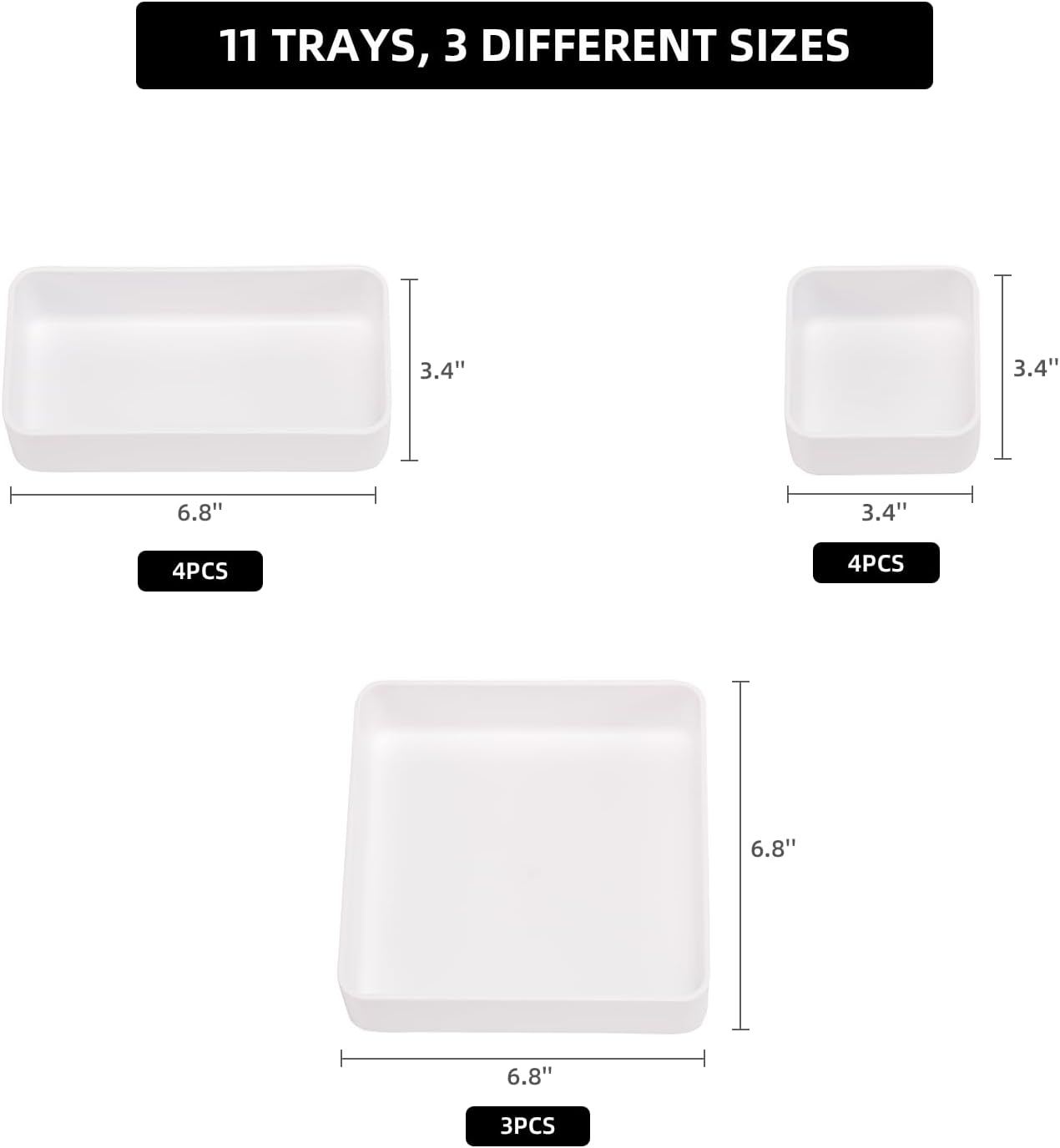 • INCLUDES: 11 stackable trays each measuring 2 inches deep. Tray measures 6.8 x 6.8 inches (3 pack), 3.4 x 6.8 inches (4 pack), 3.4 x 3.4 inches (4 pack).