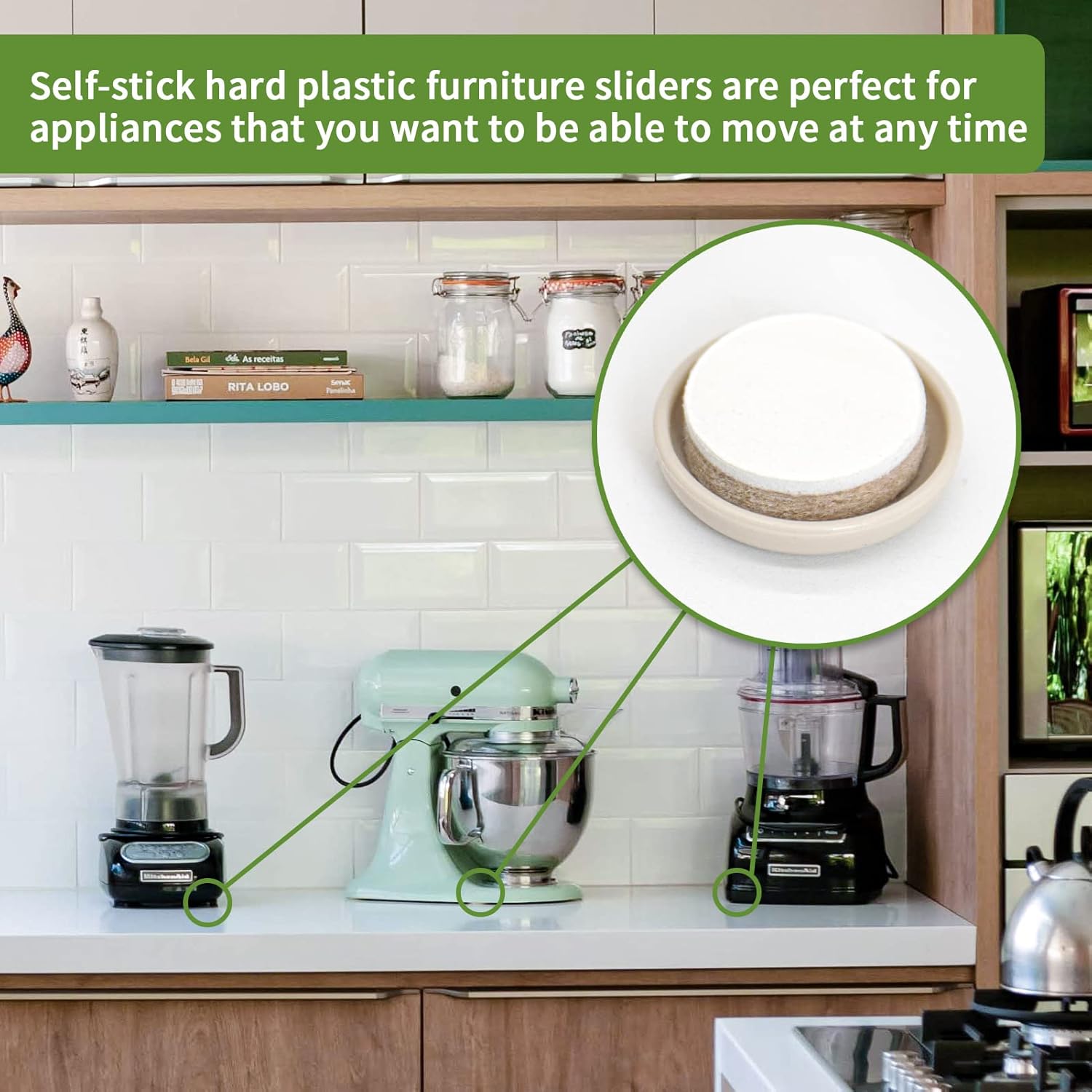 • 【Convenient Kitchen Appliance Slider】Stick the sliders around the bottom of the appliance firmly or attach on a wooden broad. It can not only increase the height so that the bottom of the machine does not touch water, but also allow the machine to be pushed, dragged and even rotated.