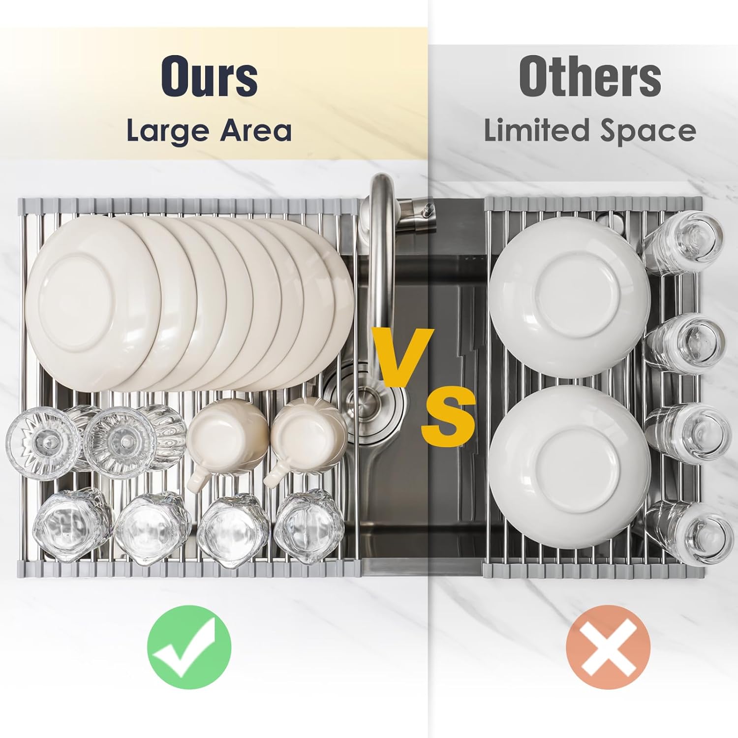 Tomorotec 21" x 15.5" Roll Up Dish Drying Rack Over Sink Drying Rack Sink Cover Kitchen Sink Accessories Gadget Multipurpose Organizer Foldable Stainless Steel Drainer