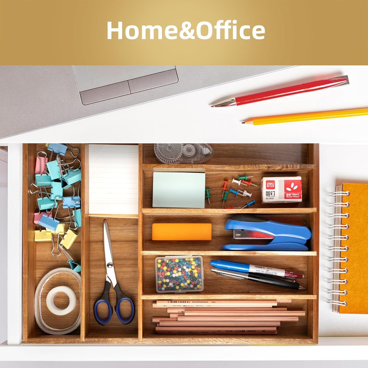 • 【Keep Your Home Tidy】This beautiful 7-compartments cutlery organizer has 2" deep compartments and can be placed into any drawer or desktop, which helps you to see everything at a glance and keep away from messy. The perfect space-saving acacia wood silverware organizer helps you to reach the desired item that you are looking for. Whether you are looking for your favorite knife or spoon, this utensil organizer makes it completely simple. We highly recommend to measure your drawer before order.