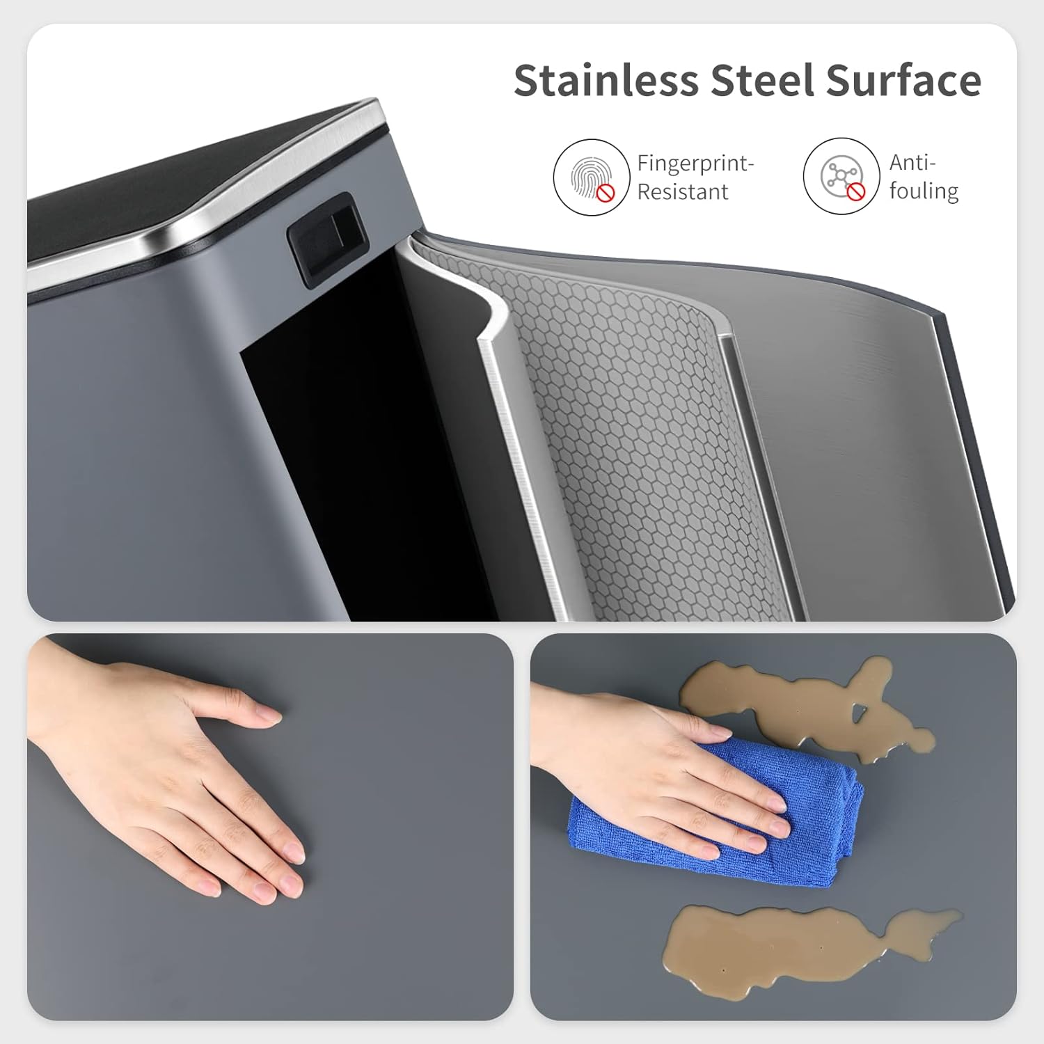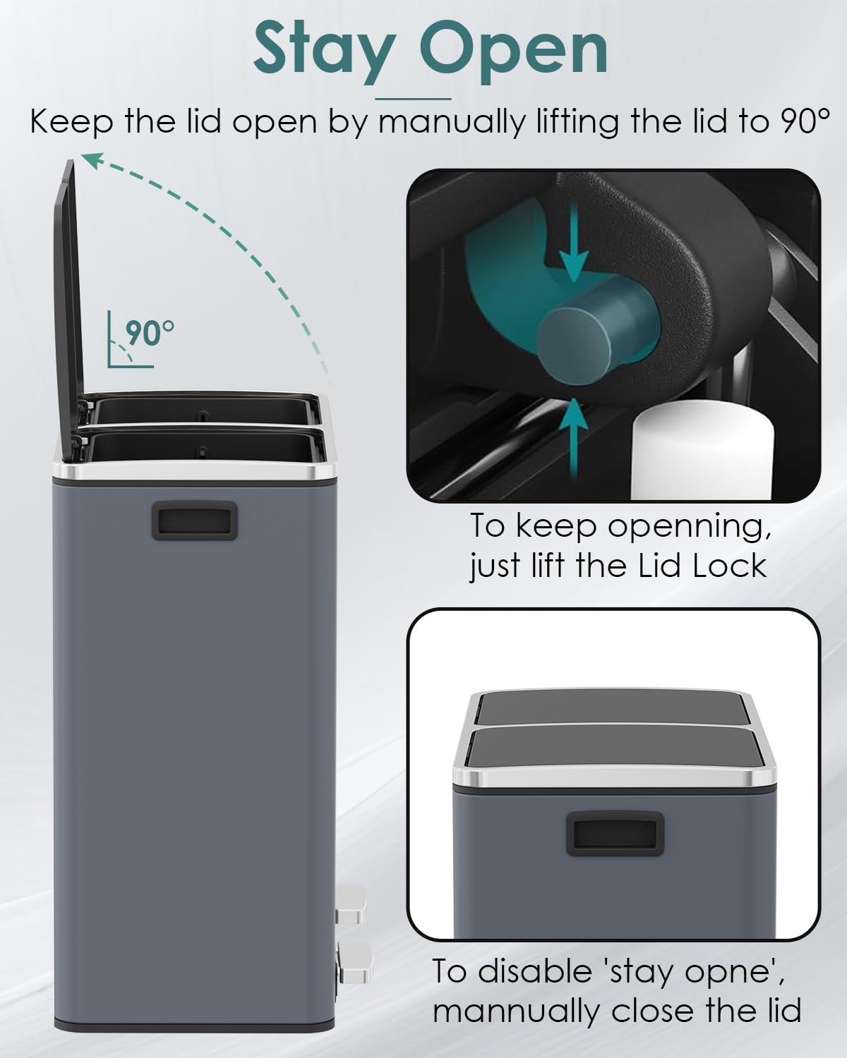 • 2*8 GALLONS COMPARTMENTS: Trash can has two independently compartments for trash and recyclables, making it easy to sort waste.