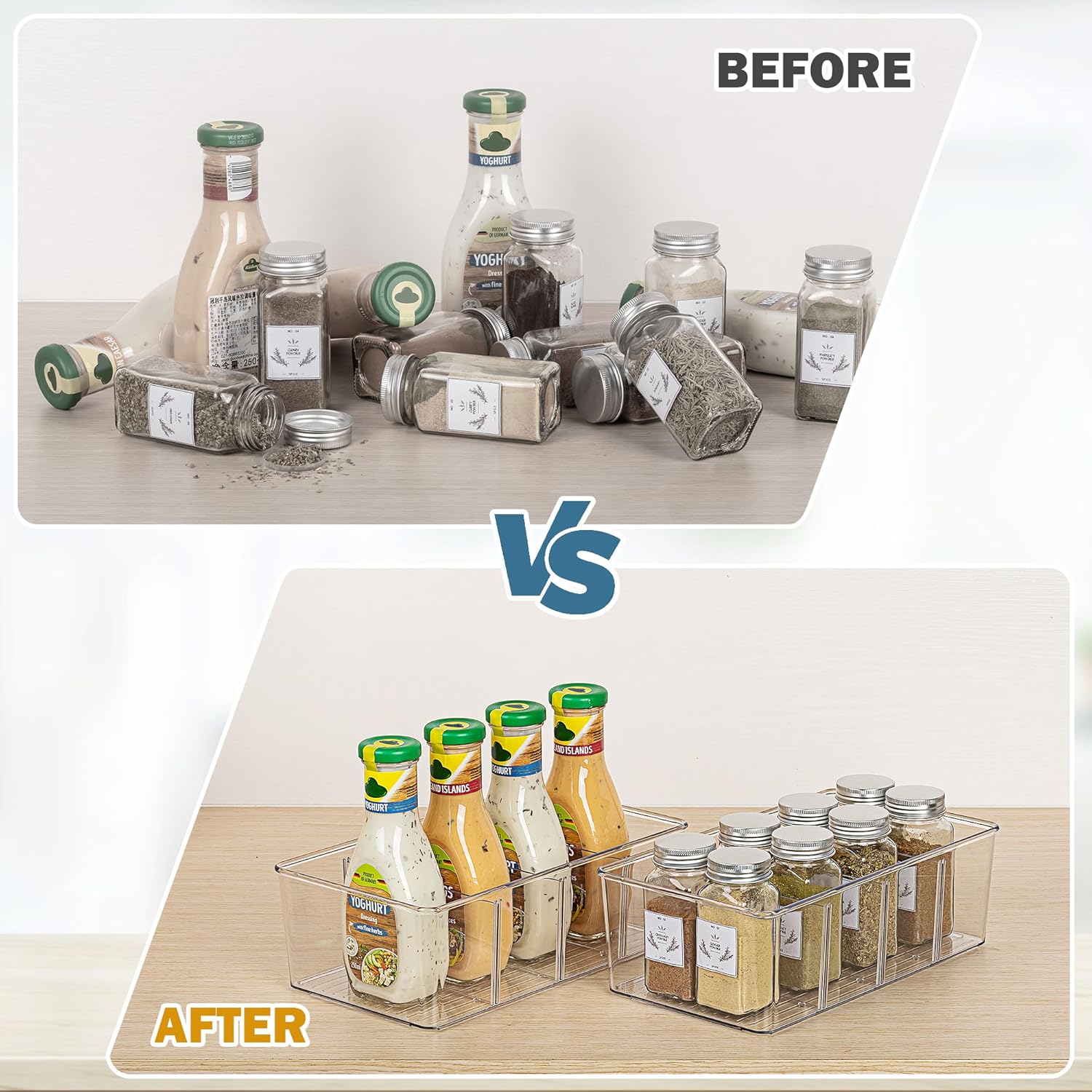 • Removable Dividers — There are 3 removable dividers in each food storage organizer bin, making it easy to separate and organize your items, you can quickly see and grab what you need.