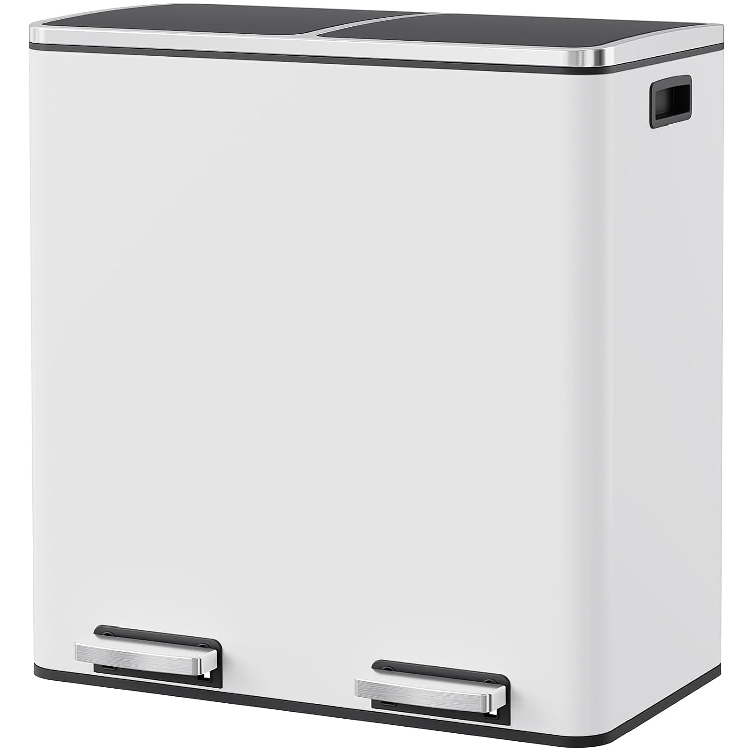 Arlopu 16 GallonStainless Steel Trash Can, 60L Dual Compartment, Metal Kitchen Step Recycle Bin, Metal Double Dustbin, in-Home Garbage Rubbish Can W/Removable Liner Buckets (White)