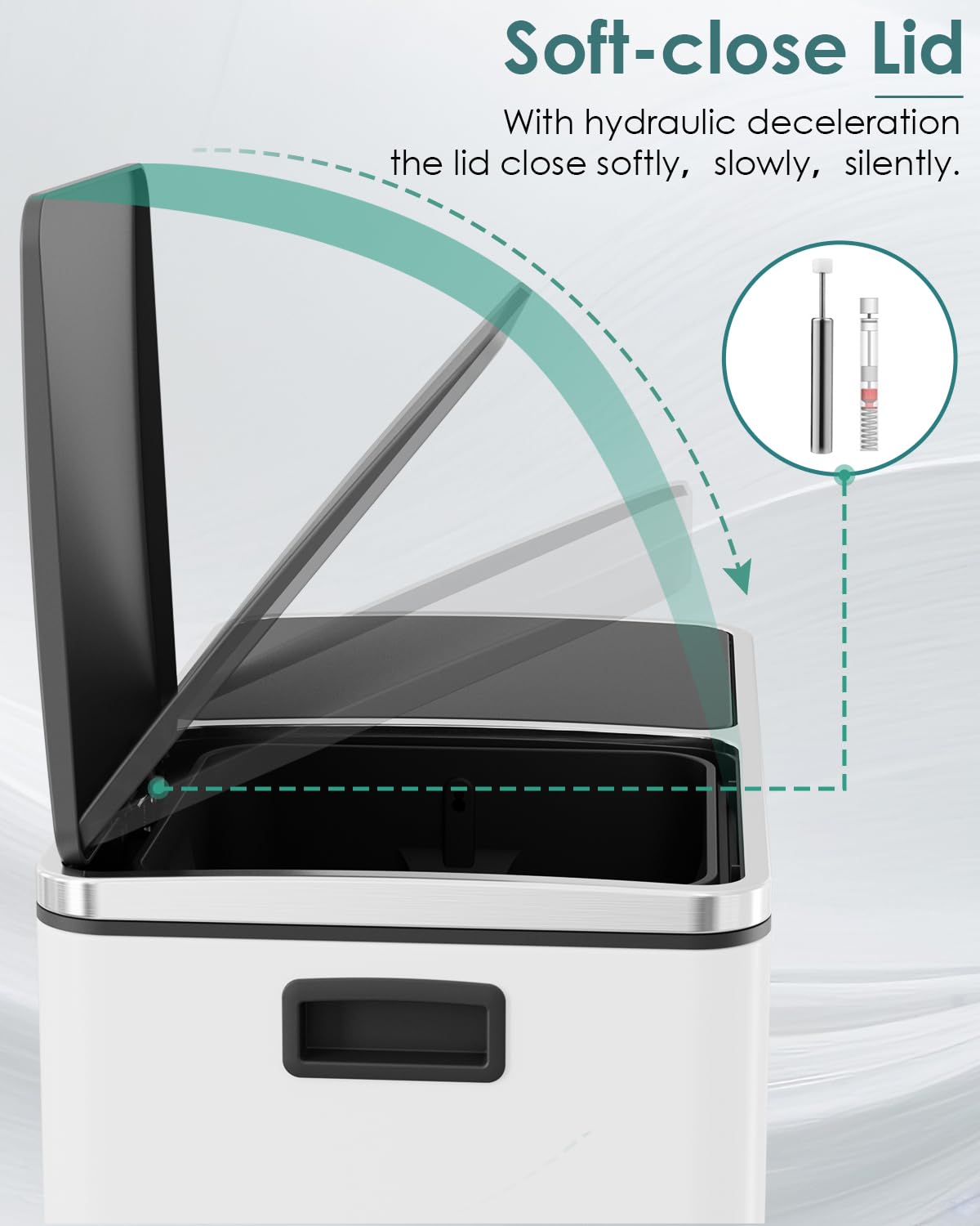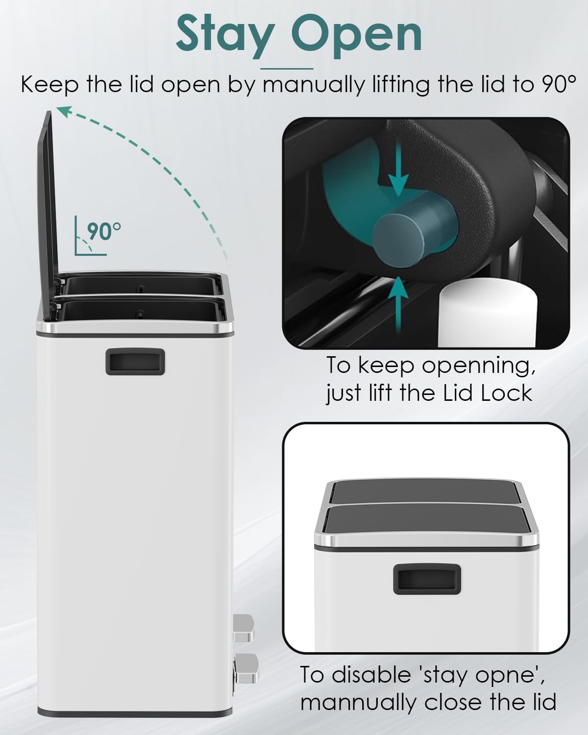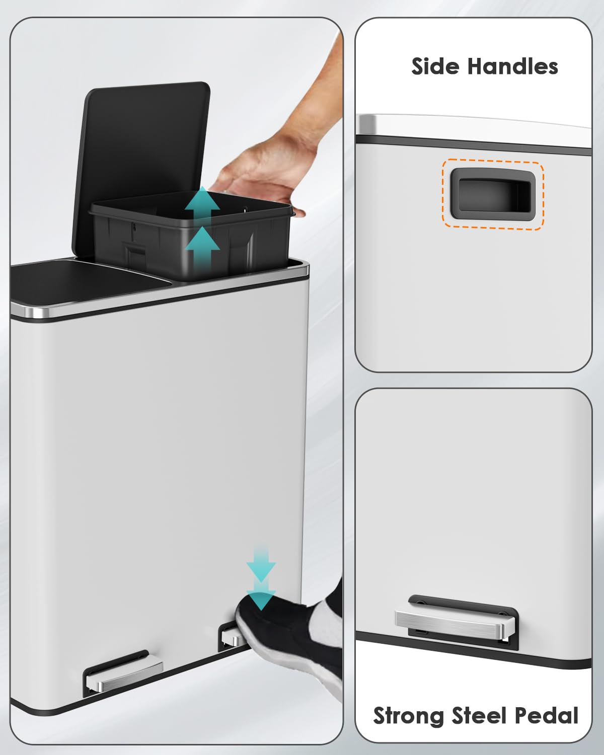 • 2*8 GALLONS COMPARTMENTS: Trash can has two independently compartments for trash and recyclables, making it easy to sort waste.