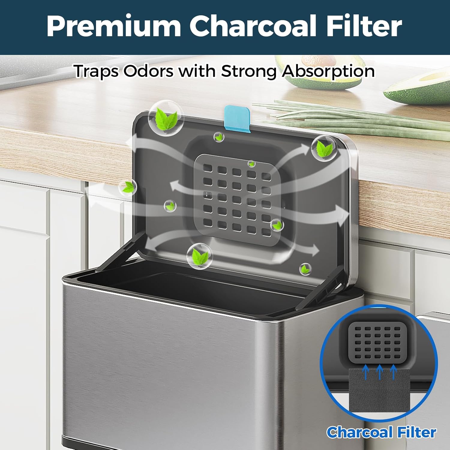 • Odor Absorbing Filter - The activated-charcoal filter included inside this trash can (NOT in other brands) traps and absorbs odors without leaking funky smells. Stainless steel trash can with lid enhances the sealing effect, specifically designed to hide smelling and fruit fly free.