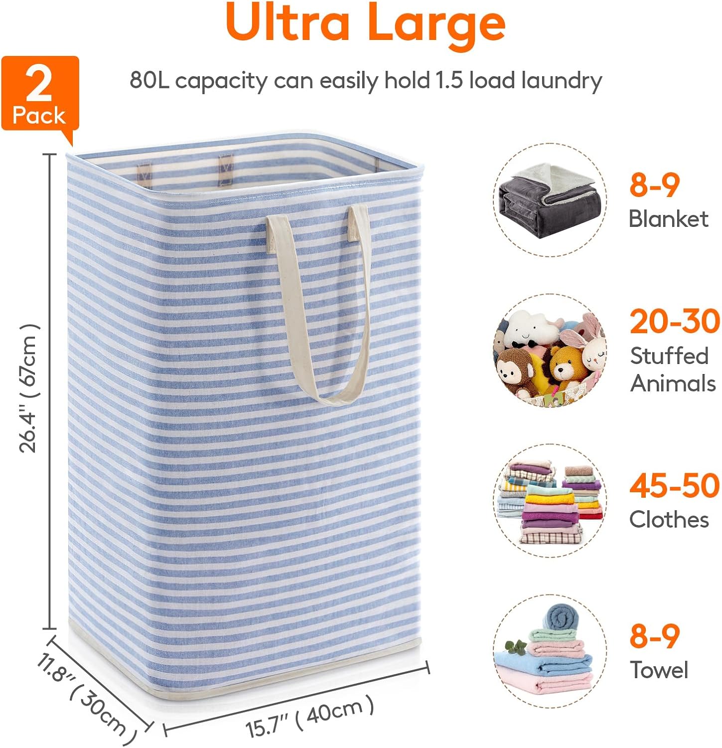 • Ultra Large: The laundry hamper measures 15.7 x 11.8 x 26.4 inches (L x W x H) with a capacity of 80L and 2 of set which easily contains 1.5x2 loads of laundry. It can hold a lot of items such as dirty clothes, wet towels, sheets, etc.
