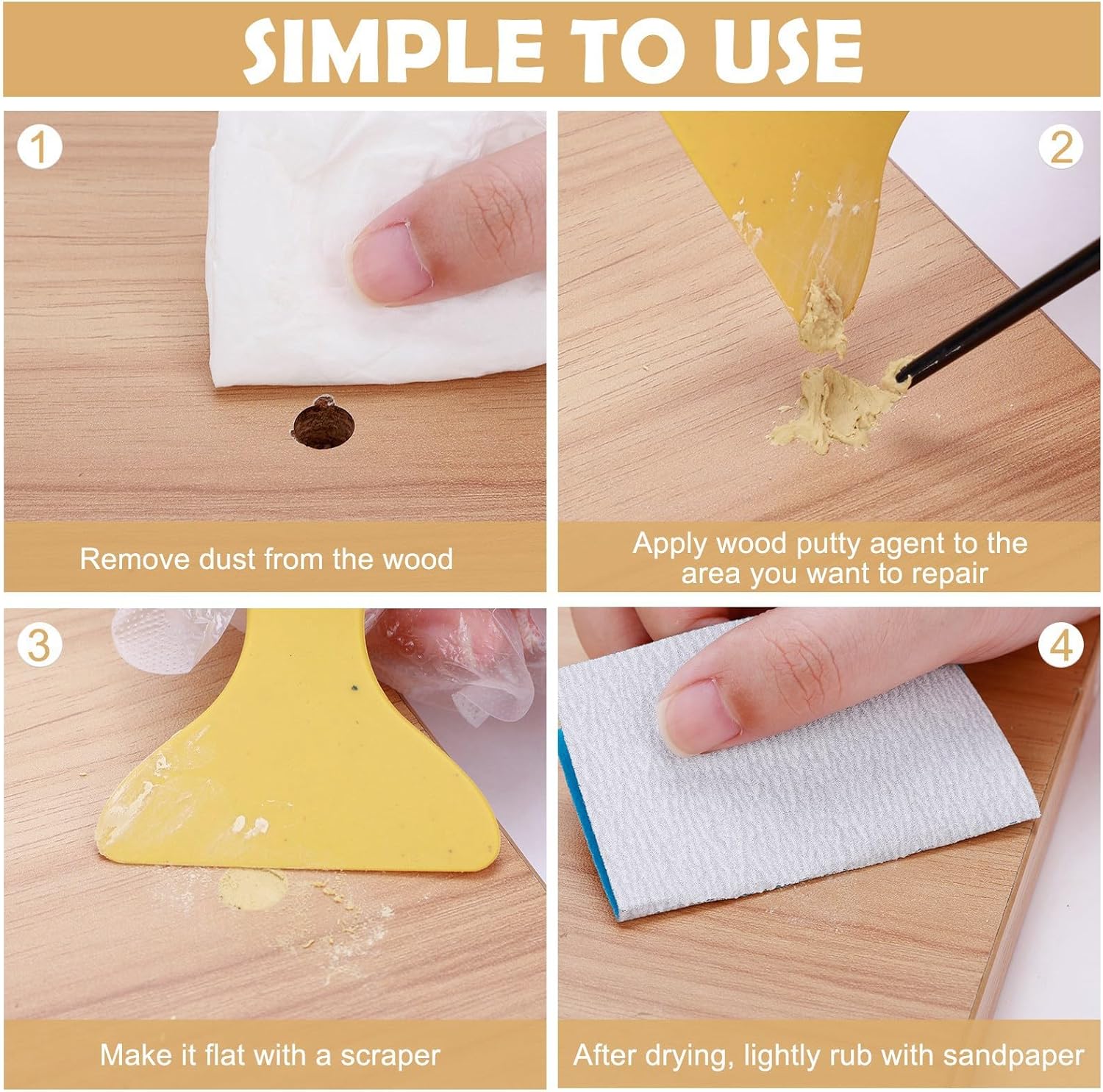 • Easy to Use:This natural wood putty is the most widely,easy-to-use,water-based wood filler in the world.Simply apply where needed,wait for more than 3 hours to allow the wood hole filler to dry naturally,and then sand with sandpaper.Please wear gloves when using.