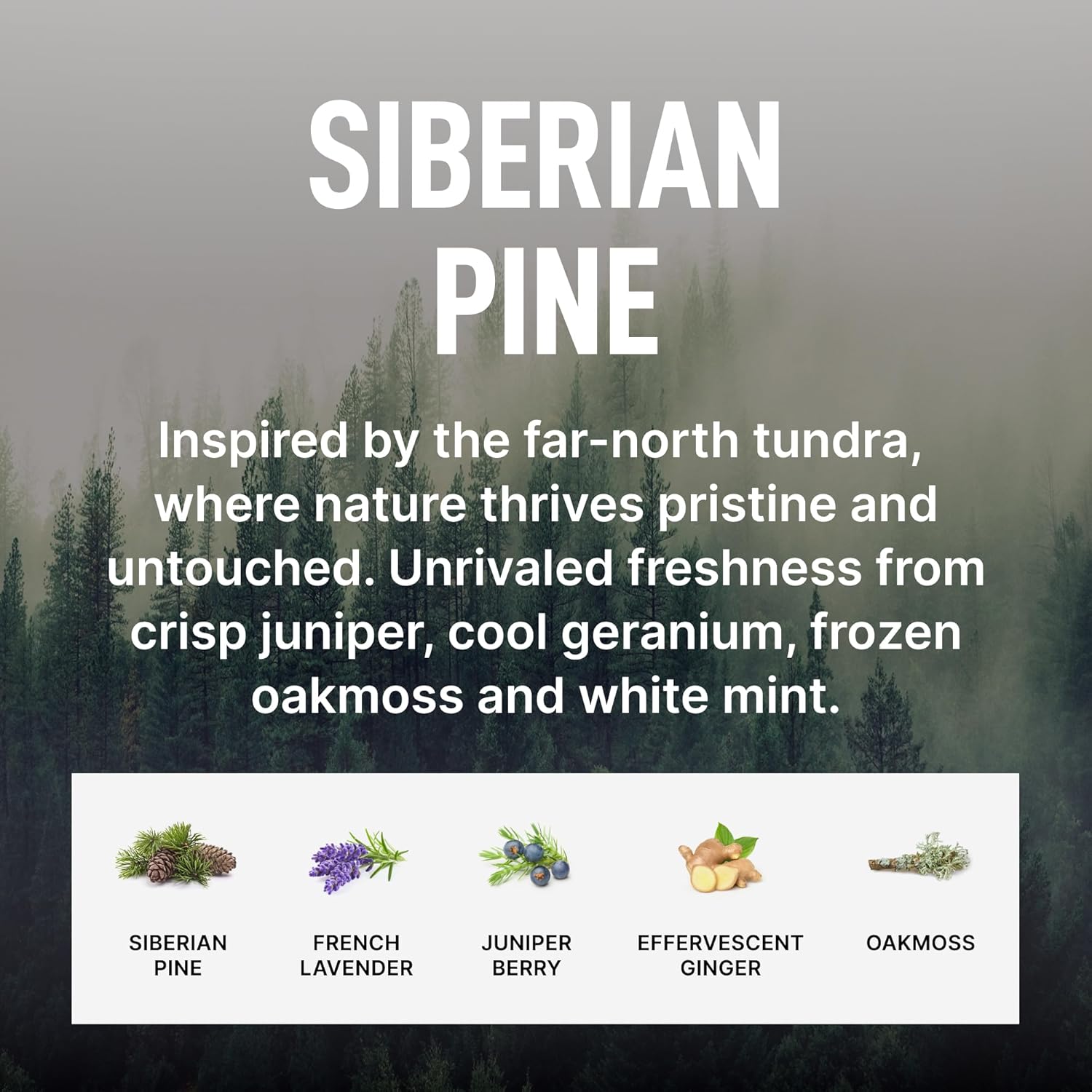 • Siberian Pine: Inspired by the far-north tundra, where nature thrives pristine and untouched. Crisp juniper, cool geranium, frozen oakmoss and an ethereal touch of white mint combine to create an unrivaled freshness. Precious amber adds a feeling of clean, while the purity of tonka brings a touch of softness.