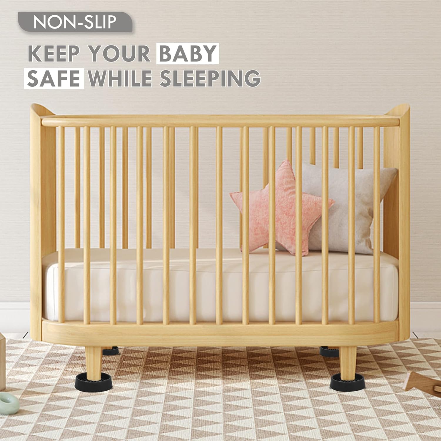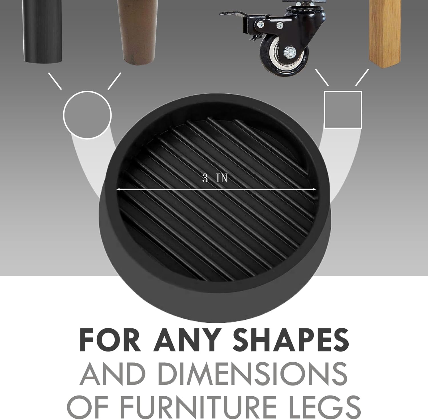 • ENOUGH SIZE - 3X3 Inch black round rubber caster cups, Each round rubber casters cup is large enough to hold the legs of most furniture, and the classic black perfectly with the wood to make the whole look match.