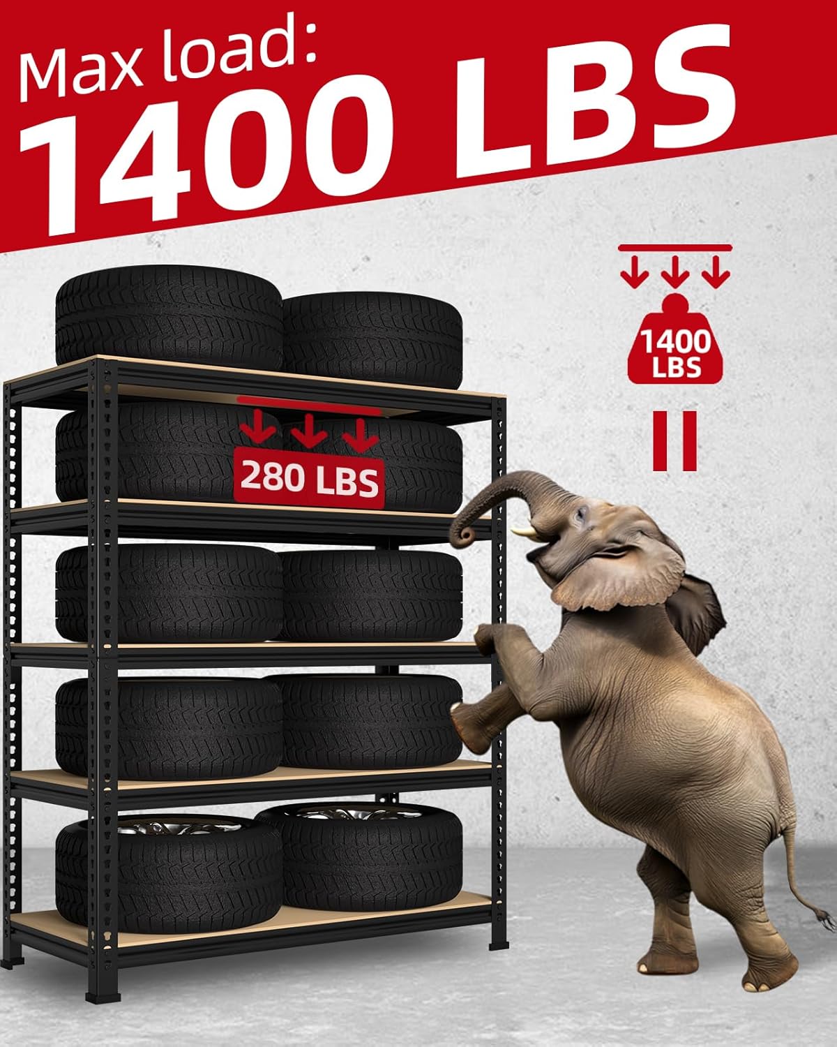 • 【 HEAVY DUTY & LONG-LASTING】: This 5-tier garage shelving is made of high-quality 0.3" thick MDF boards and heavy duty galvanized metal frame, sturdy and enduring. The metal frame is covered with premium powder coating to give it a smooth surface. Each shelf holds up to 280 lbs, 5 tier shelves' total max load weight is 1400 lbs