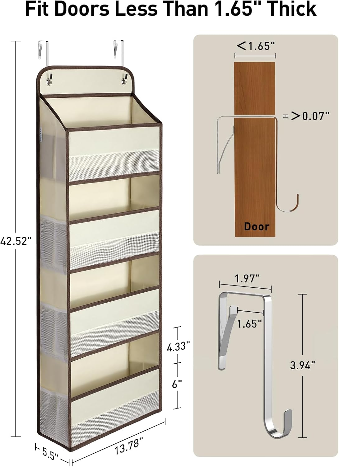 • Easy to Assemble: Afraid of tricky assembly? Don't worry. Our behind door organizers for bedroom can be assembled in 30 seconds, simply by hanging the hook on the door, hanging the organizer onto the hooks, and inserting the 4 bottom cardboards, all done! Additionally, our special clip-on hooks add more flexibility, making the bathroom storage shelves universally fit solution for doors less than 1.65" thick