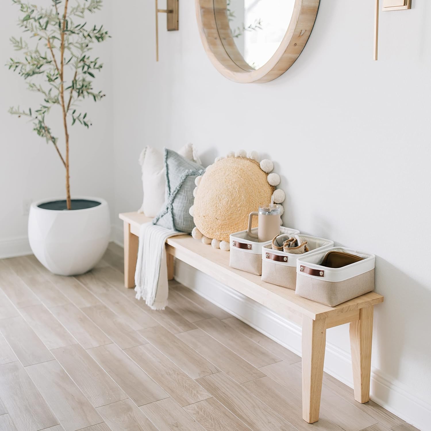 • Decorative Fabric and Vegan Leather – These versatile storage baskets for organizing your everyday life are made with a thick, high-quality fabric and fitted with leather handles to add a stylish touch to a living room, bedroom, office, or personal space.