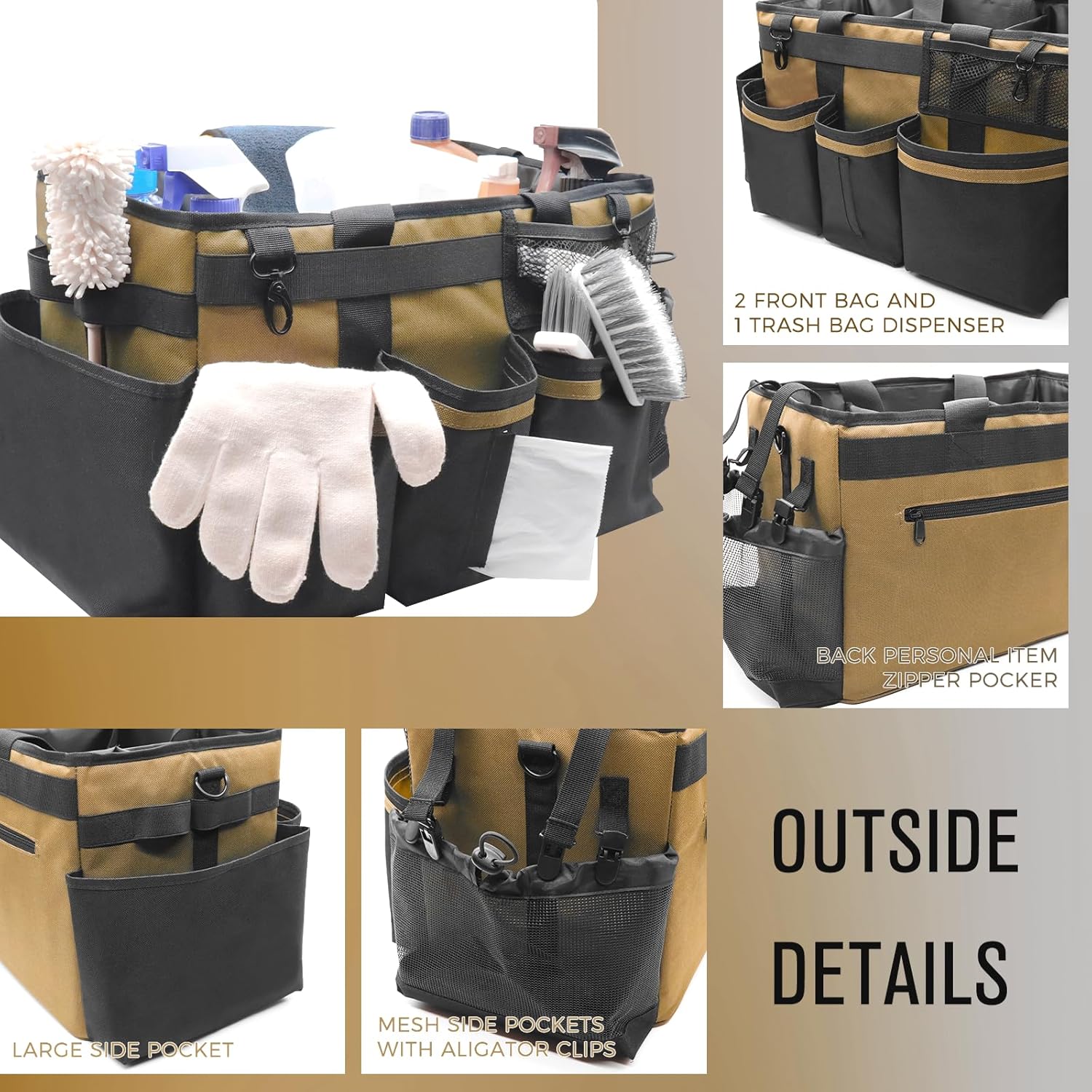 • Exquisite Details: The 5 inner compartments are large enough for organizing cleaning tools. 3 individual deep outer pockets, 1 mesh side pocket and 1 trash bag dispenser allow you storage and access of other cleaning tools. Also, securely zipped pocket is design for safely storing your important items