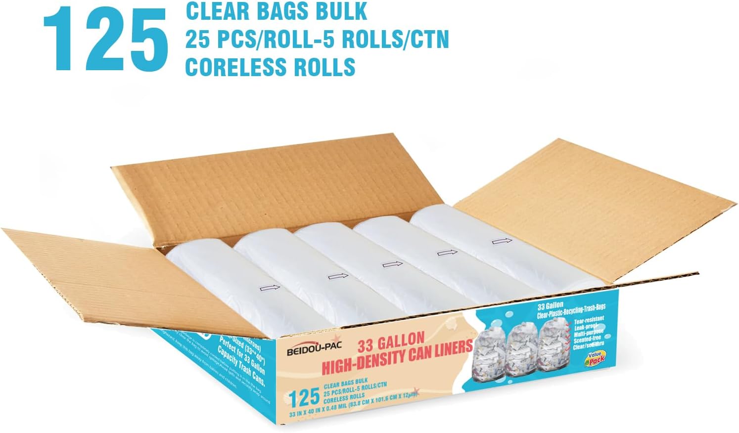 • 1, Product information: BEIDOU-PAC 33 gallon large clear plastic recycling Can Liners, Size: 33"*40"x 12 mic, Total 125 clear bags bulk (25 PCS/ROLL, 5 CORELESS ROLLS/CTN), Perfect for 33 Gal Capacity Office, commercial, industrial, or residential waste.