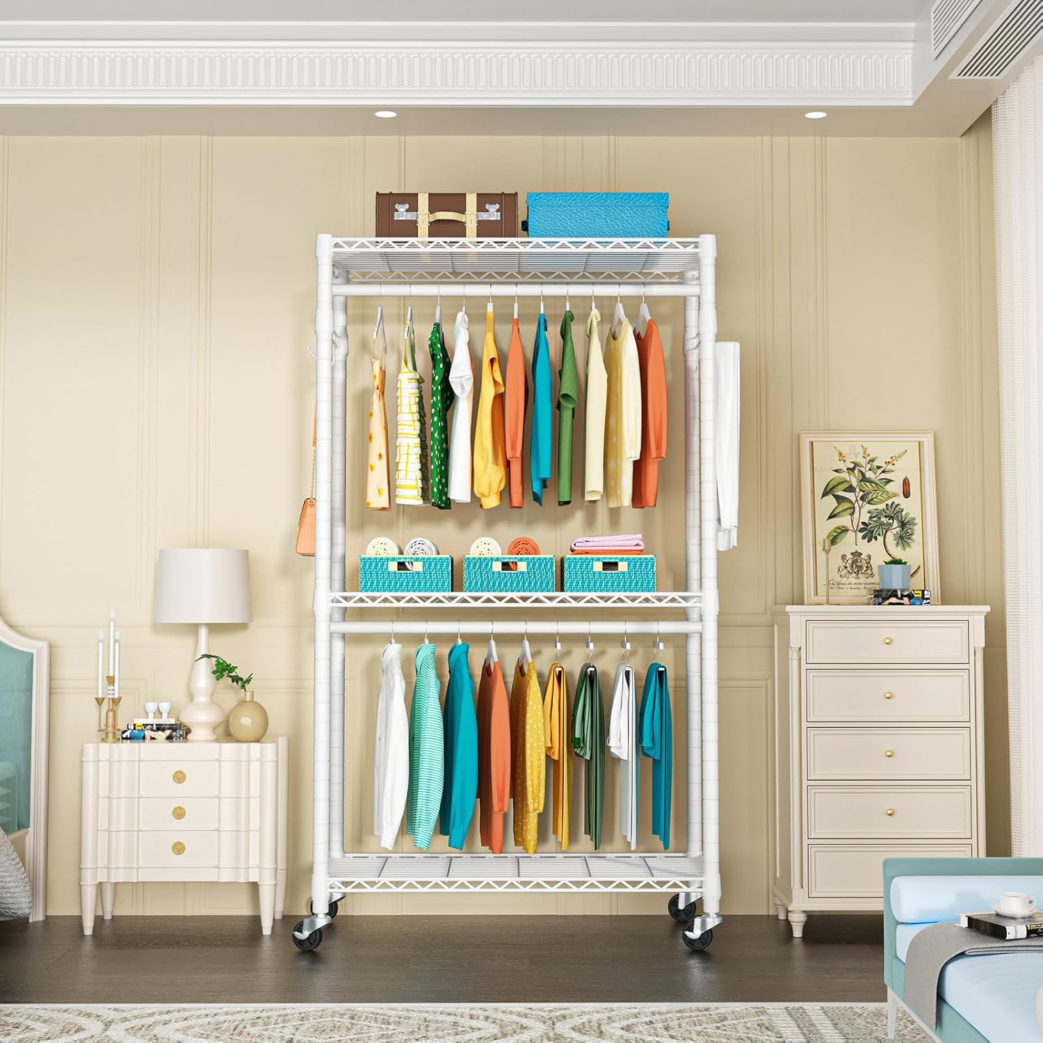 FUTASSI P1 Heavy Duty Garment Rack, 3 Tiers Adjustable Rolling Metal Closet Organizer with Lockable Wheels, FreeStanding Wardrobe with Double Hanger Rods & 1 Pair Hooks, Max Load 450 LBS, White