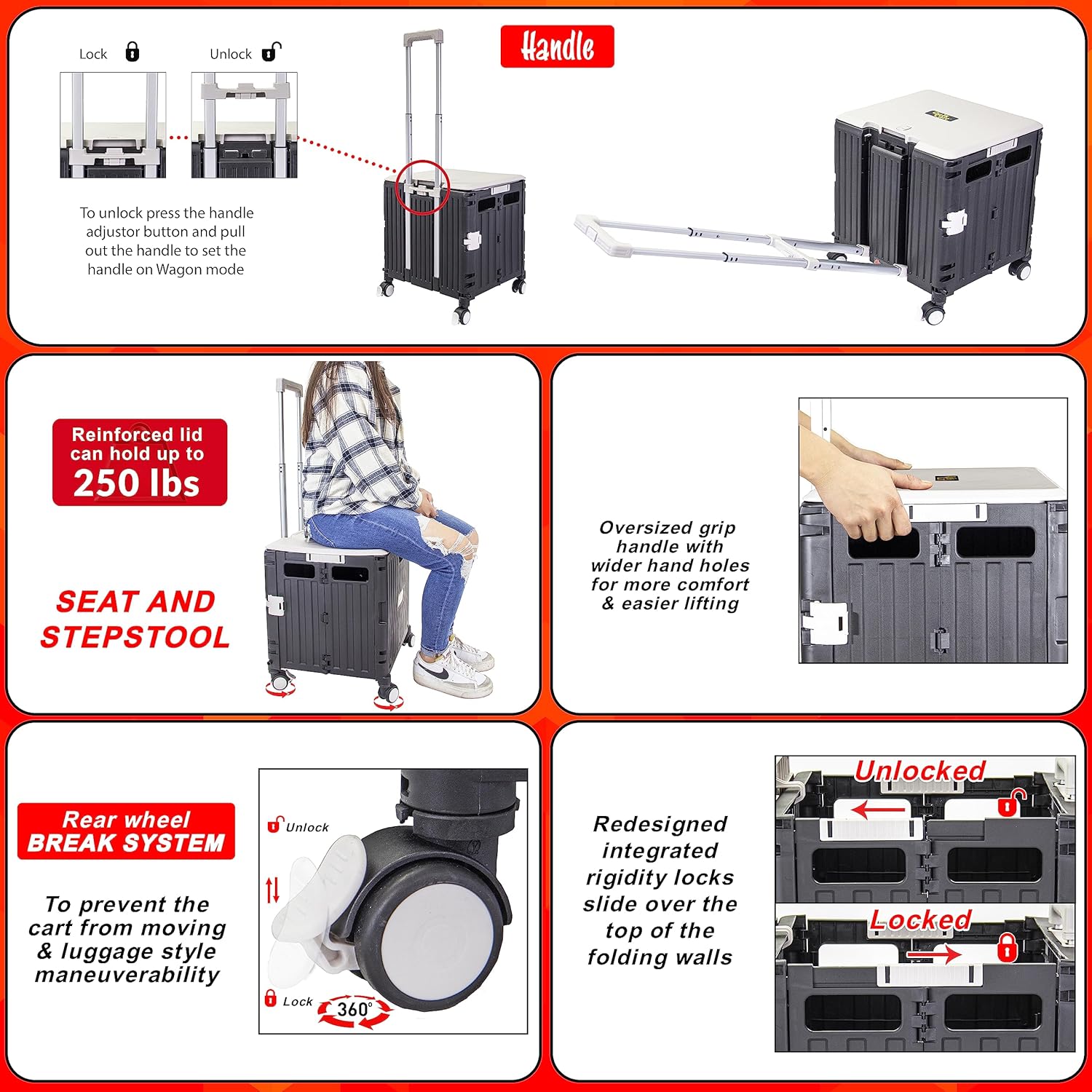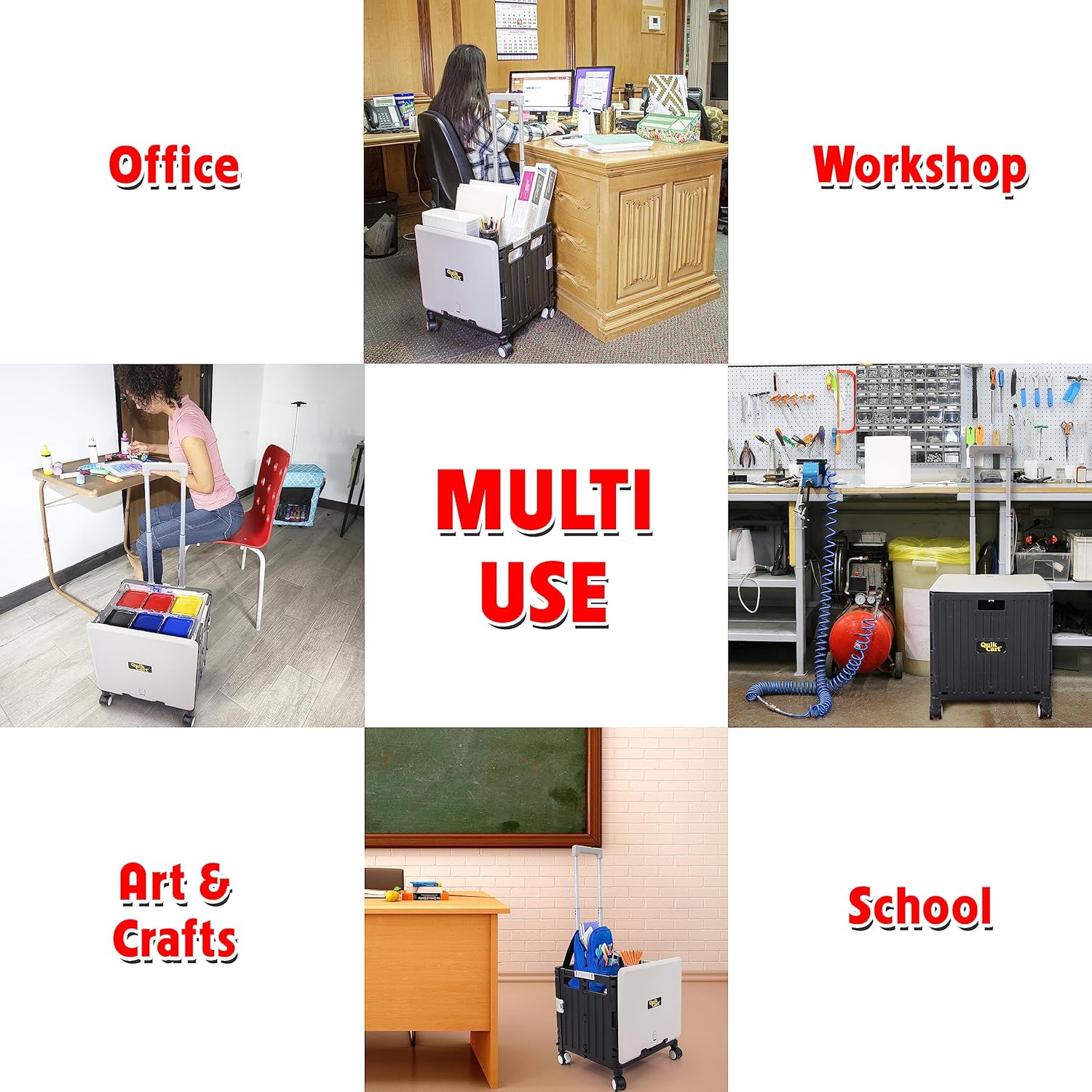 • Collapsible: Folds down to only 3-inches thick for compact storage weighing less than 8-pounds. ideal for groceries, milk Rolling totes, pull cart and plastic crate are ideal file organizers, rolling utility cart, and pull cart.