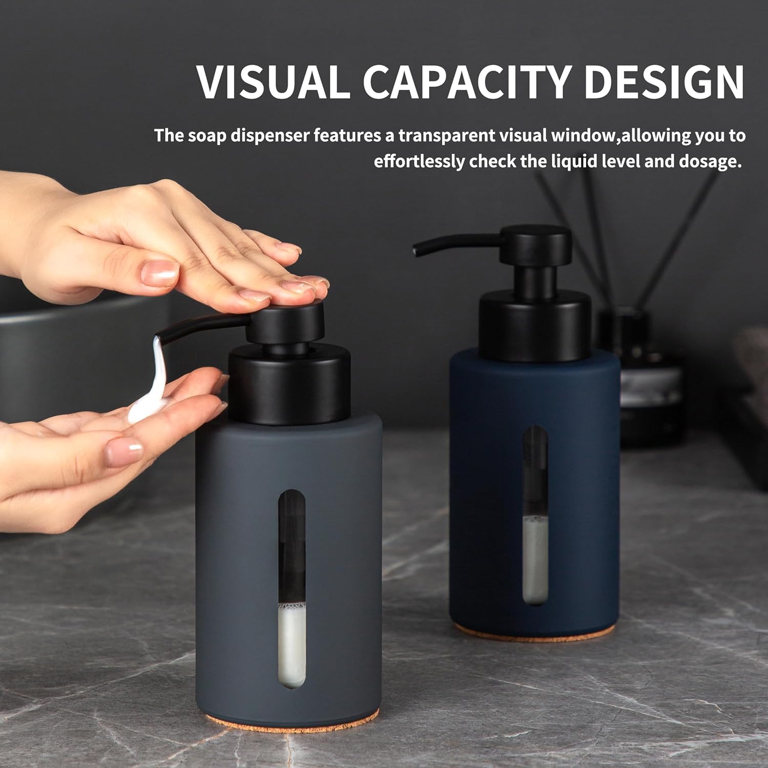 • Visual Capacity Design-Our grey soap dispenser boasts a transparent window for easy liquid level and dosage monitoring. The rubber-coated surface ensures a sleek, high-quality, and non-slip texture.
