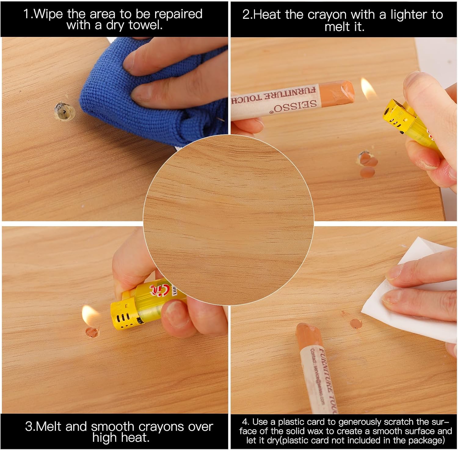 • How to Use: Choose a set of wooden crayons that match the color of your furniture. First, clean the area to be repaired with a dry towel or paper. If it is to repair the furniture whose surface is slightly damaged, you only need to gently wipe the damaged area. If it is a larger area, you can use a high temperature equipment to heat the wax, let the melted crayon drips all over the depression, then smooth it with plastic card and wait the wax dry. (plastic card not included in the package)