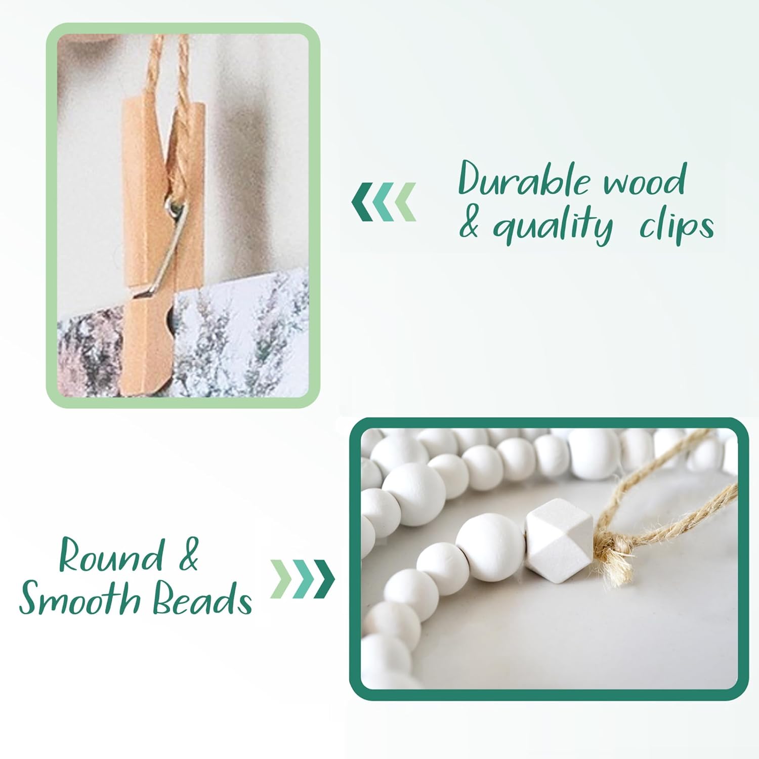• QUALITY MATERIAL: Made of round wood beads strung together using jute rope with 14 clothespins attached. Approx. 2loops on each end for easy hanging.