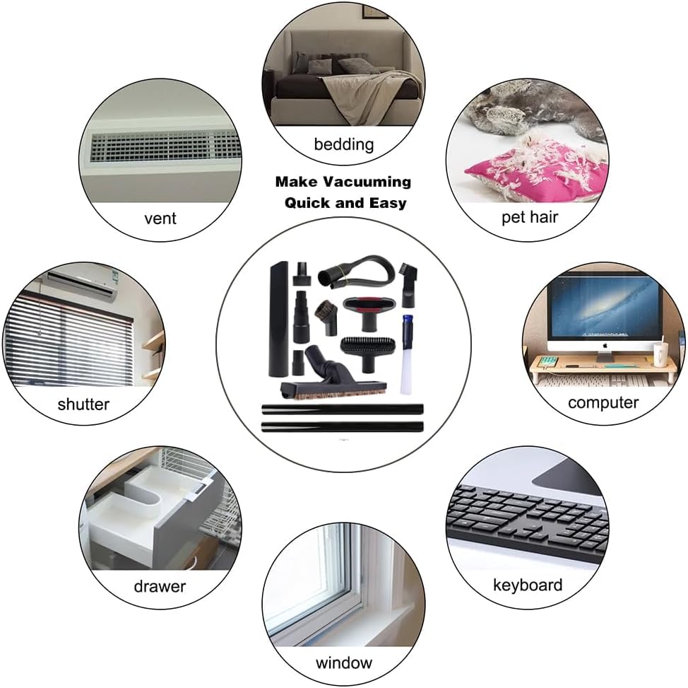• 【Save Ti̇me &Energy Vacuum Attachments Kit】Vacuum attachments for Shop vac includes 2 1/2" to 1 1/4" Vacuum Hose Adapter, 1 7/8" to 1 3/8" to 1 1/4 to 1" and 1 3/8" to 1 1/4" vacuum adapter, 12in wide vacuum brush attachment, 1 1/4" horsehair vacuum brush, 1 1/4" flexible crevice tool, 1 1/4" vacuum crevice tool, 1 1/4" upholstery tool attachment, 1 1/4" utility nozzle with removable plastic brush, 1 1/4" brush & nozzle combination tool, dusty brush and 3 pcs vacuum extension wand.