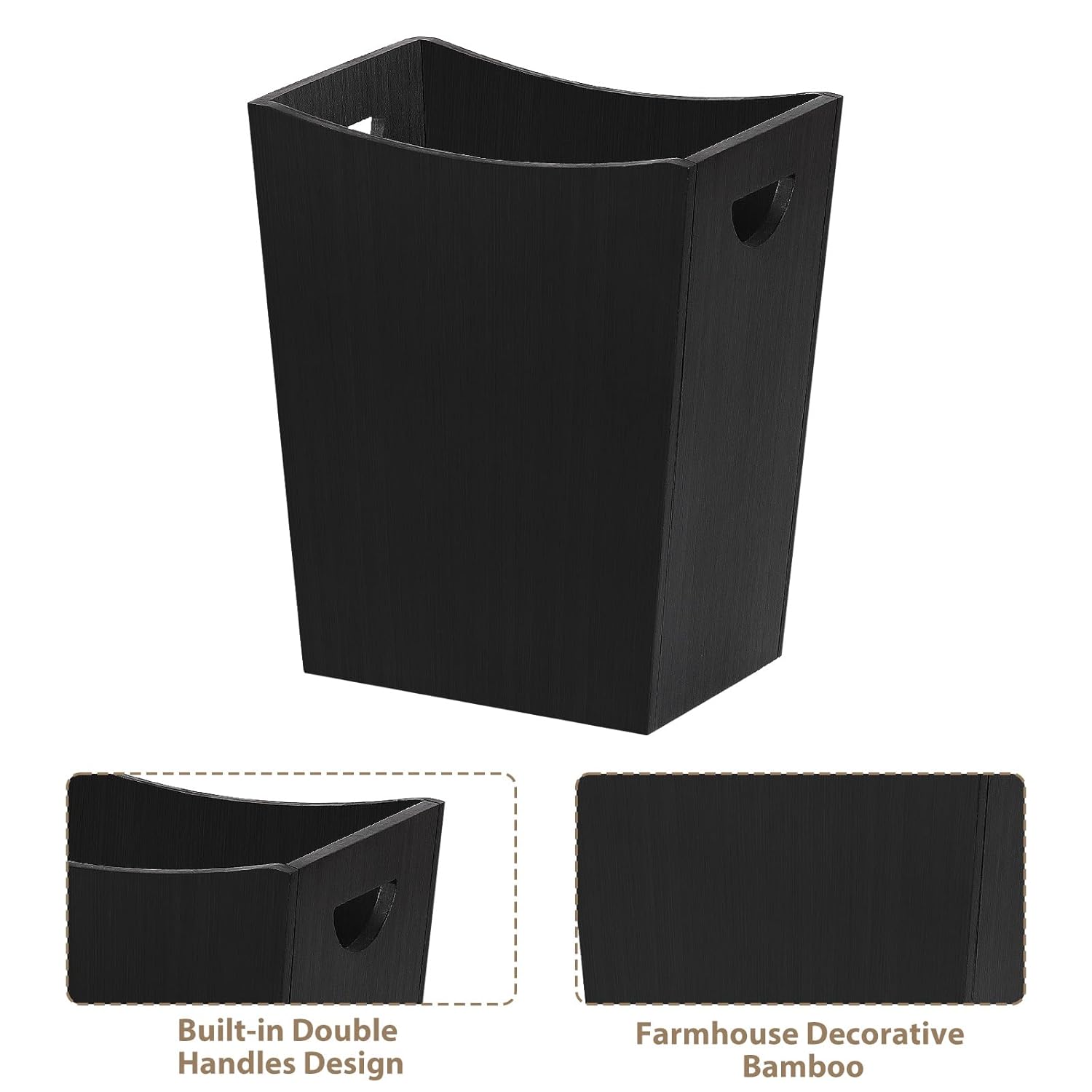 SEHERTIWY Wood Trash Can, Farmhouse Wastebasket Bin for Bathroom, Office, Bedroom, Living Room, Small Square Rustic Garbage Container (Wood-Black)