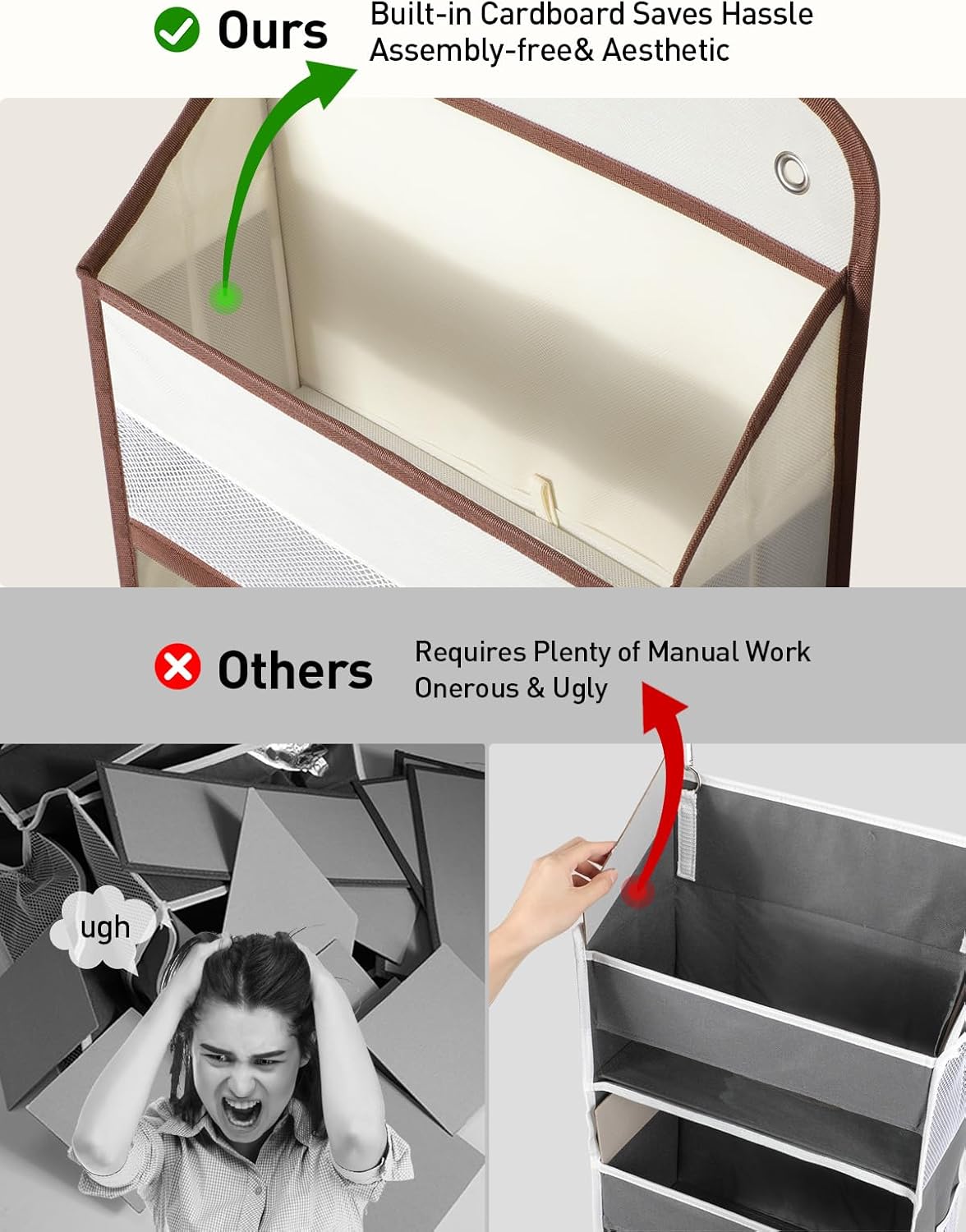 • Easy Assembly, No Hassle: Unlike other brands' door hanging organizer bedroom that comes with piles of cardboard that need complicated manual assembly, Our over the door storage comes pre-inserted with cardboard in the pockets, giving you a tool-free assembly within seconds. Simply hang the hooks over the door, then hang the over door storage, insert 5 cardboard bottoms, and you're ready to go