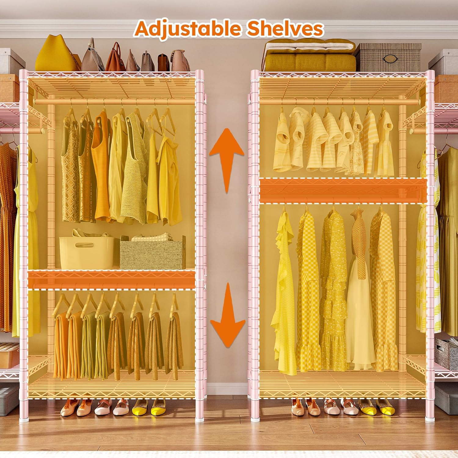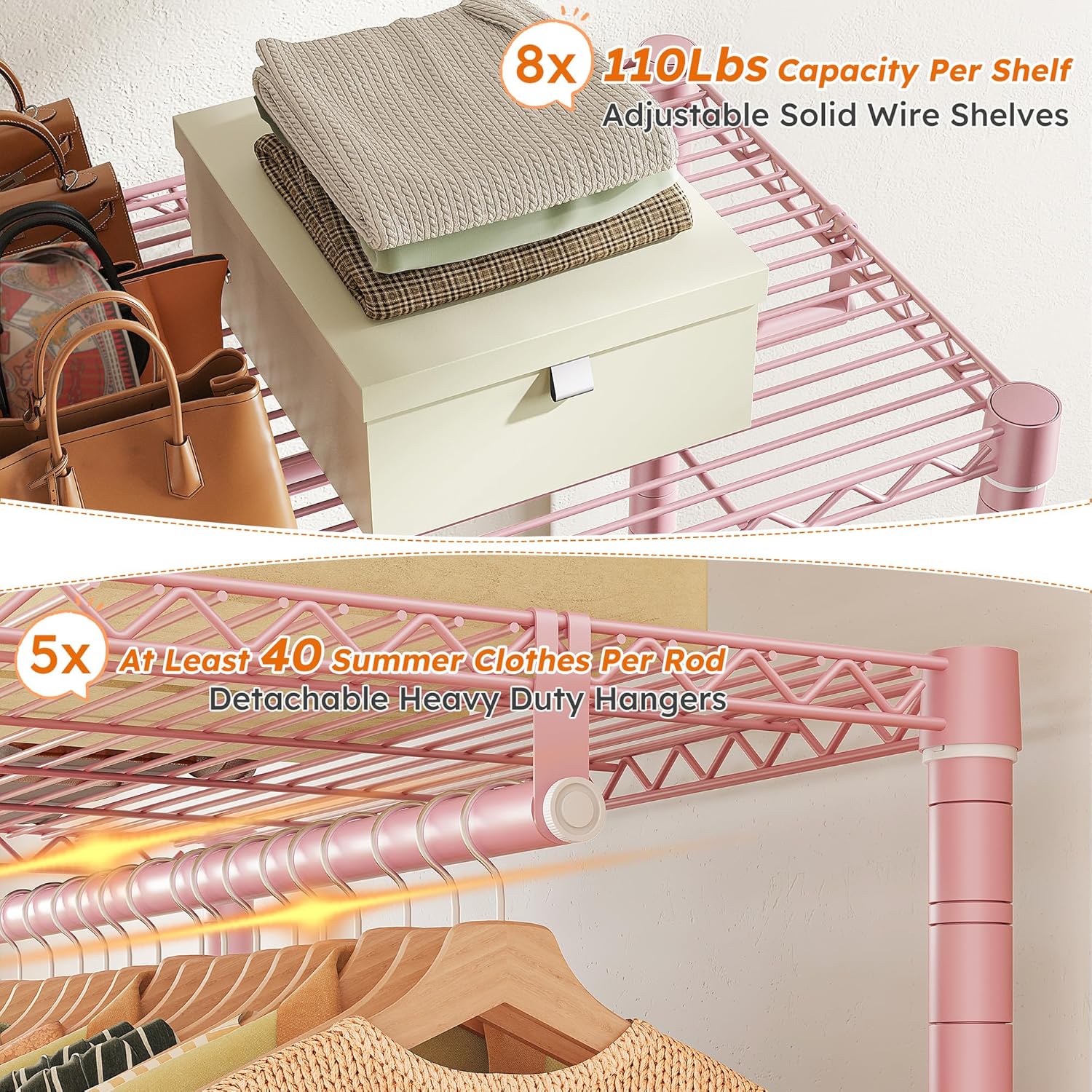 • 【Fully Adjustable & Easy-to-Adjust】This garment racks for hanging clothes has 8 wire board(110Lbs capacity per tier) and 5 hanging rods(80Lbs capacity each), they are all easily adjustable and detachable by the slip-sleeve locking system, all you need to do is assemble the clips higher or lower. A perfect DIY garment rack meets all needs.